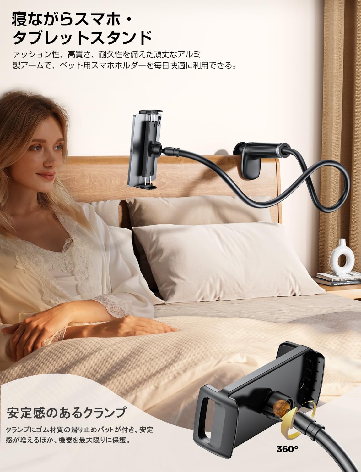 【ダブルグランプ・回転式フレキシブルアーム】タブレット&スマホ 両用 スタンド 全機種対応 iPhone&iPad アームスタンド 寝ながらスマホスタンド 携帯 スマホアーム 360自由回転 土台強化 安定性 フレキシブルアーム付き 柔軟自由調節 仰向け ごろ寝 幅広い互換性 4.7-12.9インチ