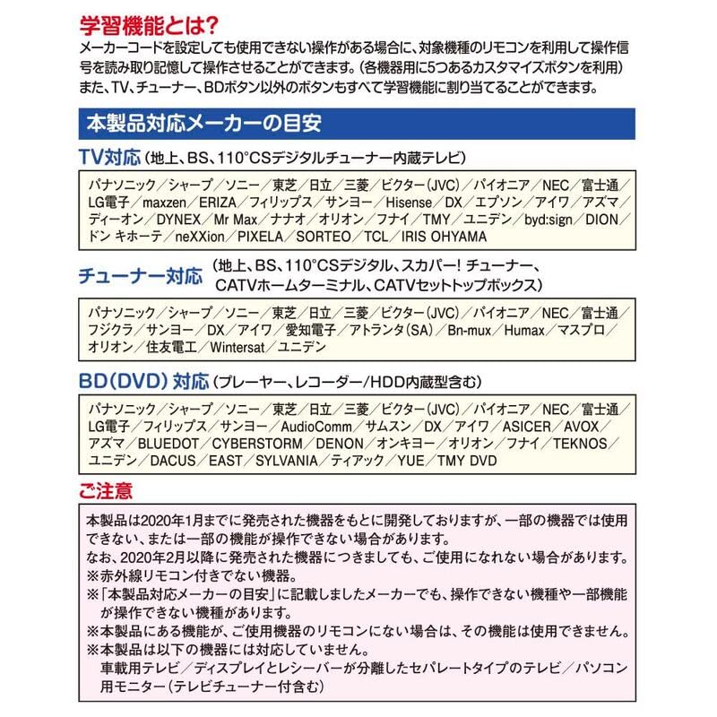 ■ 【 特 長 】 ◆最大3台のAV機器を操作できる ◆テレビ対応メーカー36社、チューナー対応メーカー23社、BD/DVD対応メーカー34社 ◆各メーカーの操作信号を登録済み、メーカコードを設定するだけ ◆学習機能で未登録の操作も読み取り記憶、便利な5つのカスタマイズボタン メーカーコードを設定しても使用できない操作がある場合に、対象機種のリモコンを利用して操作信号を読み取り記憶して操作させることができます。