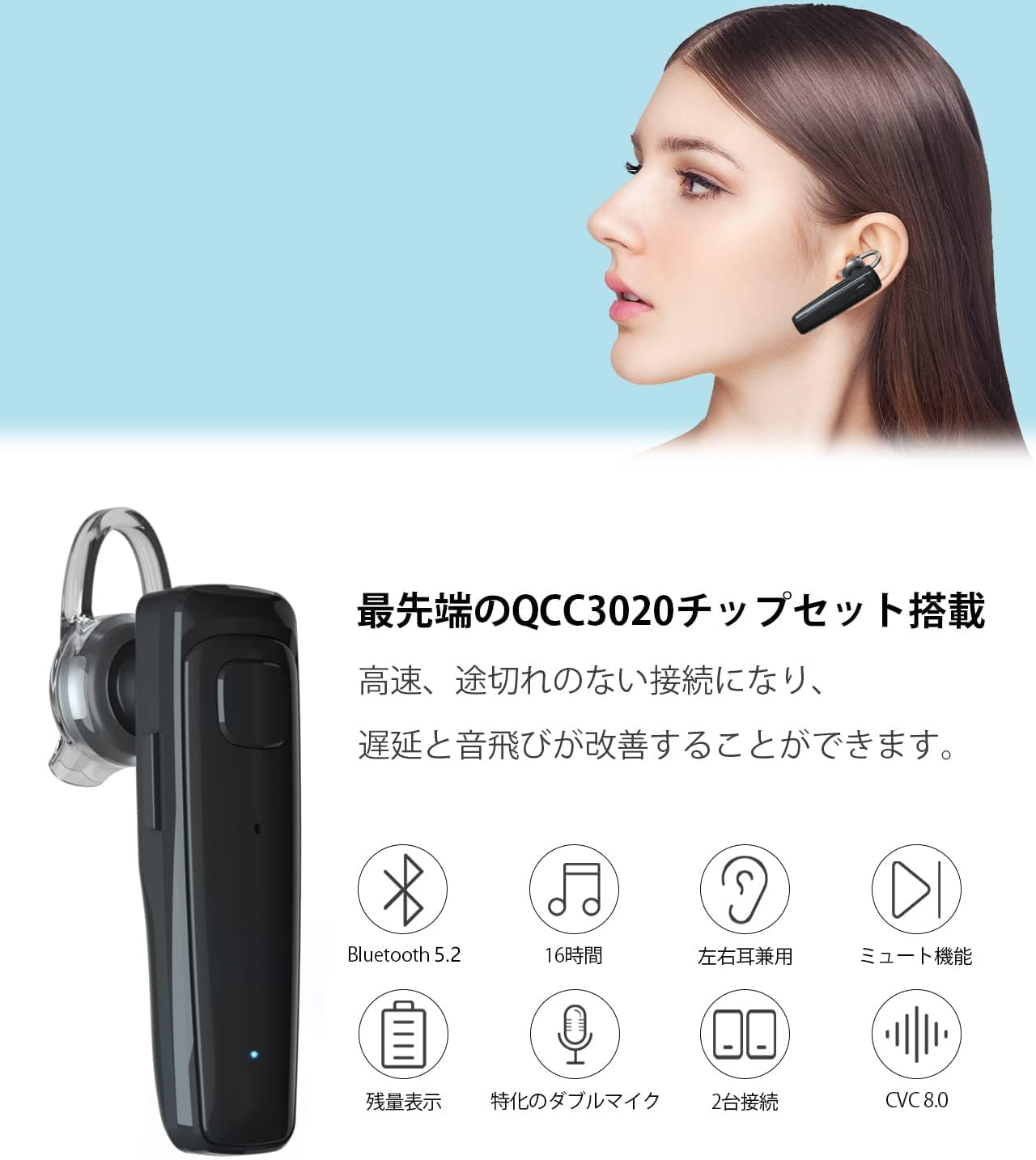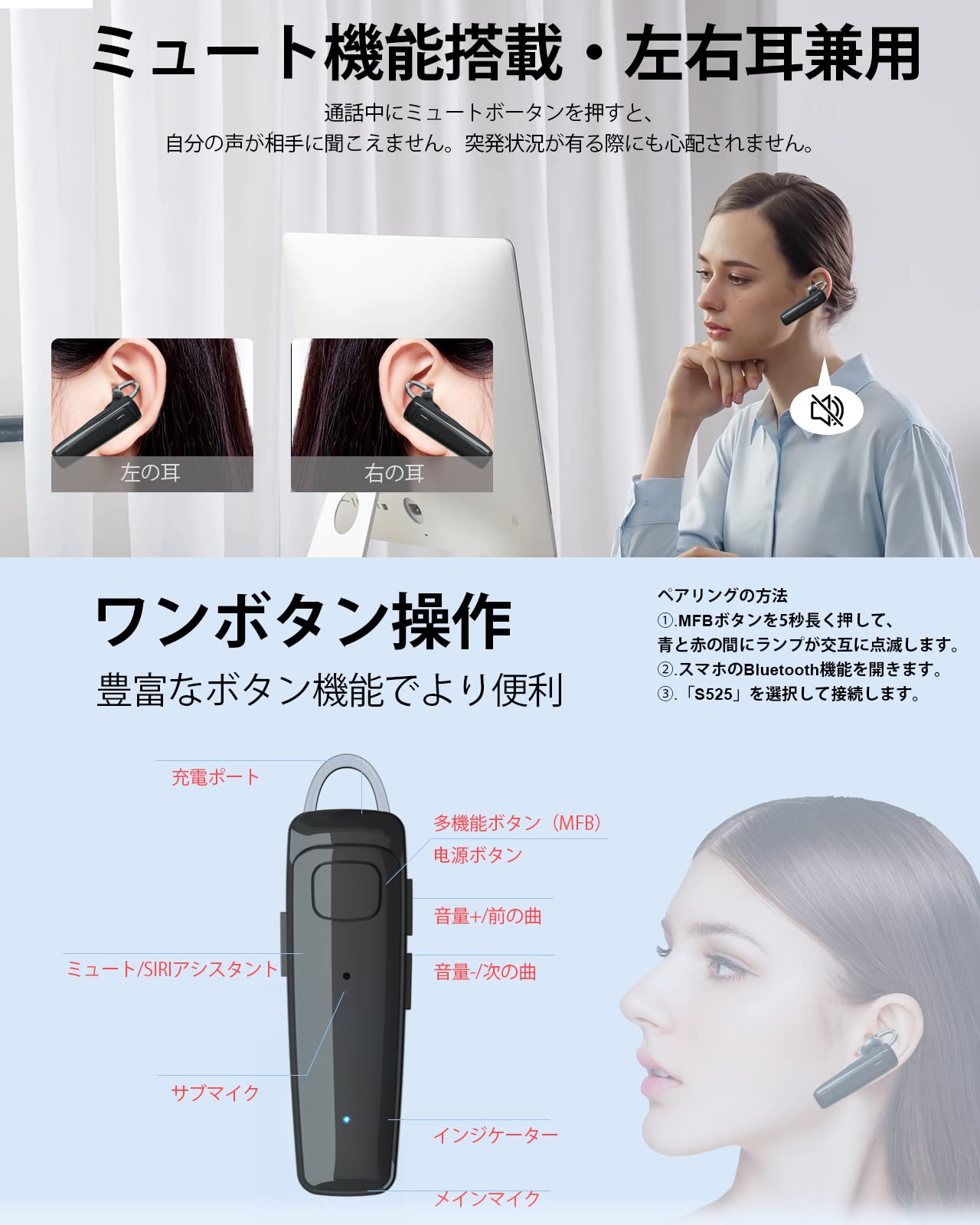 Bluetoothヘッドセット 片耳 ワイヤレスイヤホン HD通話 Qualcomm社製スマートチップ搭載〔aptX & aptX HD・AAC対応〕デュアルマイク設計 ENCノイズ低減技術 ワイヤレスヘッドセット 無痛装着 ハンズフリー通話 2台同時接続可 Siri搭載 左右耳兼用 技適認証取得 日本語取説付き S525 ブラック