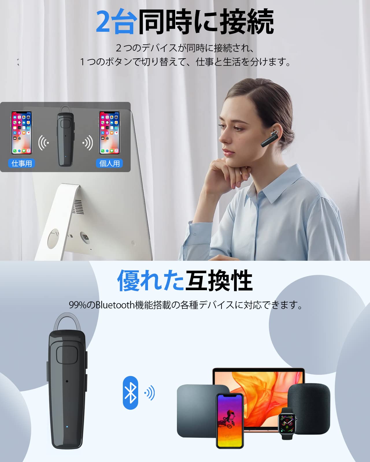 2台のデバイスと同時に接続可能です(ご注意:パソコン2台同時に接続できません)。