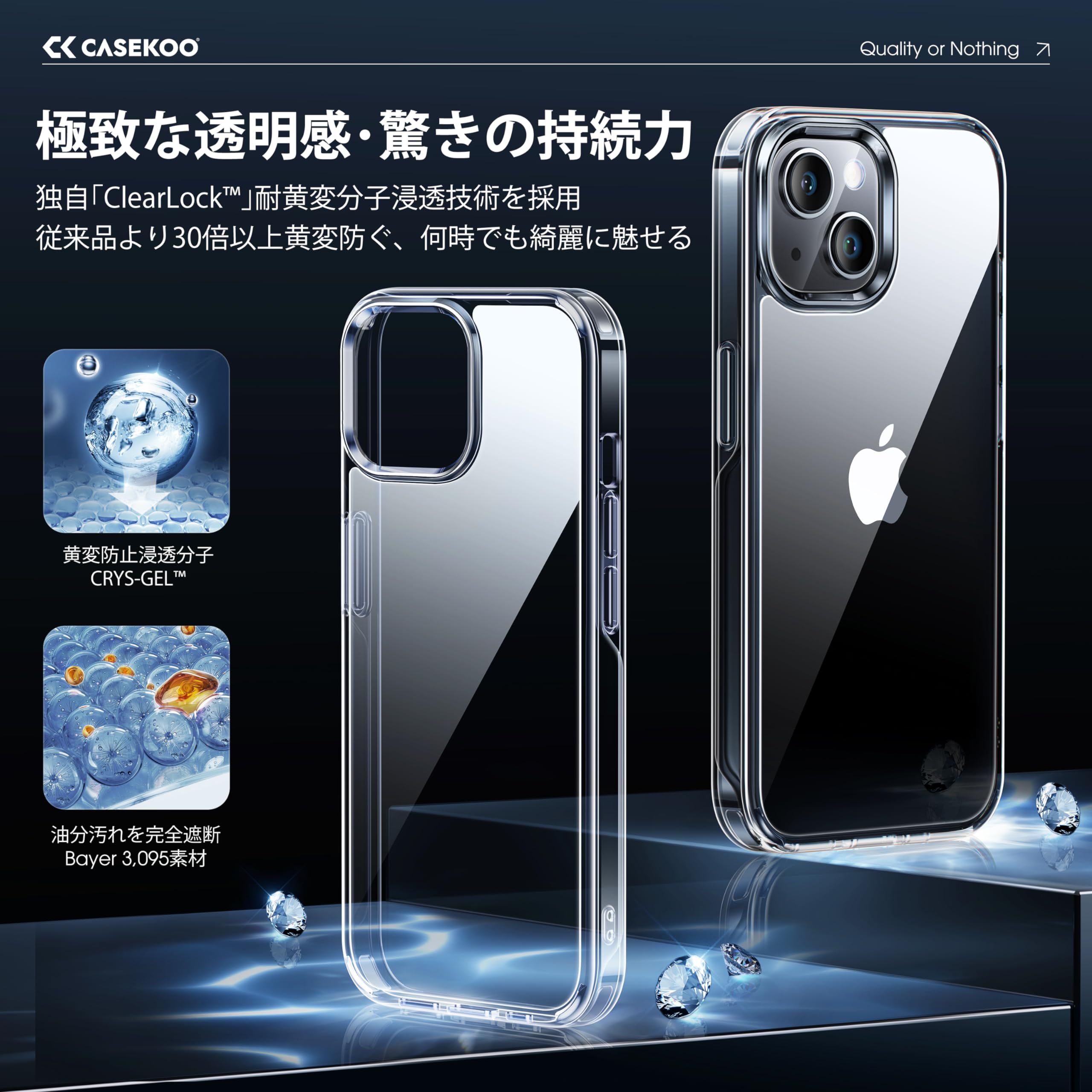 ■ 【2024年革新耐黄変技術・いつでもキレイに魅せる】 背面に高透明度と指紋軽減を両立した特殊PC素材を厳選、さらに素材の芯まで最新技術「CRYS-GEL」分子浸透する事でクリアケースあるあるの変色劣化を徹底解消!iPhone本来の美しさを損なわなず、洗練されたデザインを引き立たせる。