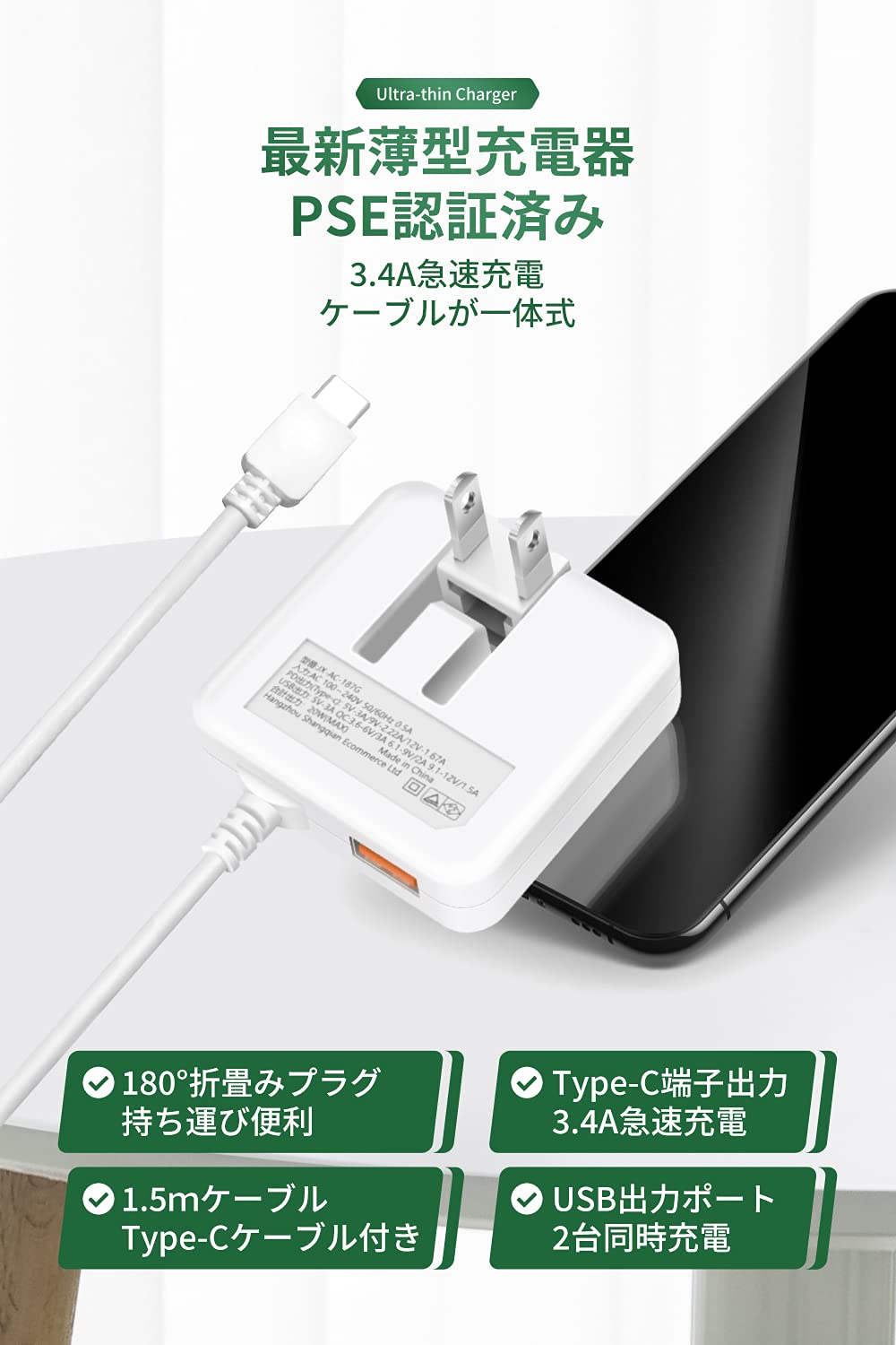 【最新薄型】PD20W 充電器 USB-C 急速充電器 Type-Cケーブル (PD20W&QC3.0/合計3.4A/1つUSB-Aポート/折畳みプラグ/PSE認証済) ACアダプター コンセント 軽量 スマホ充電器 iPhone15適用/Android/ゲーム機などその他対応