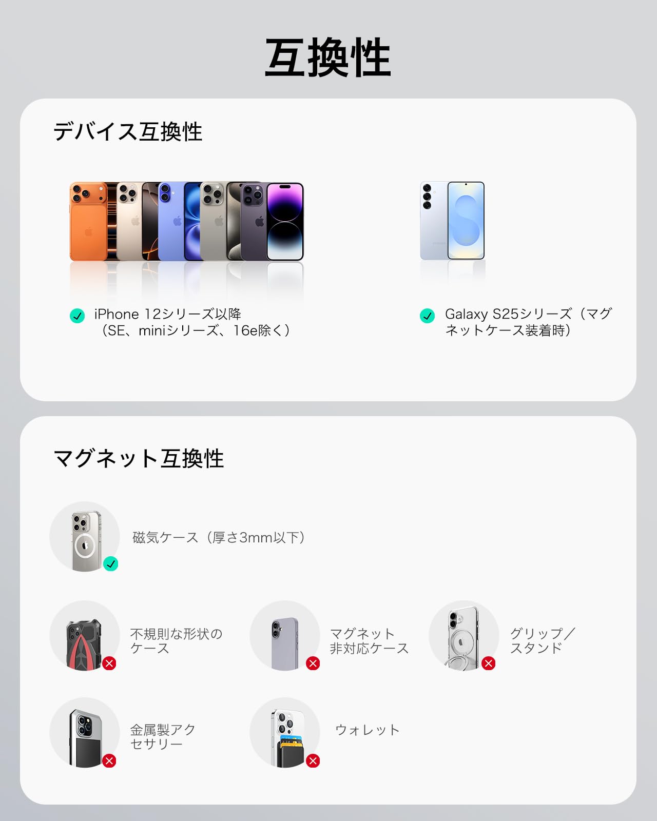 ■ 【互換性】:iPhone 17 / iPhone Air / iPhone 17 Pro / iPhone 17 Pro Max、iPhone 16/15/14/13/12シリーズ、およびGalaxy S25 Ultra/S25+/S25(磁気ケース装着時)にのみ対応しており、Xperia、AQUOS、Google Pixel、Samsung Galaxy S24以前の機種には対応しておりませんのでご注意ください。