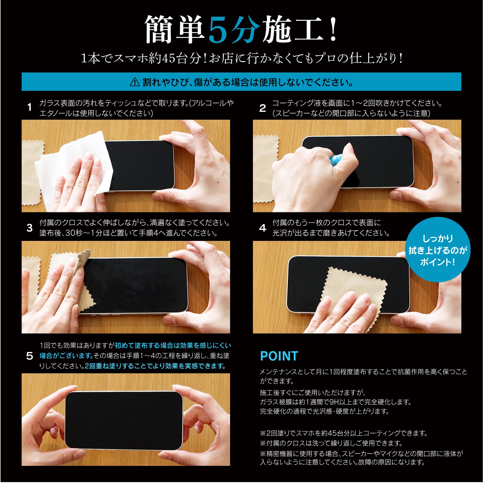 * ▶▶▶【塗布できるもの】iPhoneなどのスマートフォン、iPadなどのタブレット、スマホの背面、ノートパソコン、車内装のピアノブラック部分、リールなどの釣り具、アイアンなどのゴルフクラブ、AppleWatchなどのスマートウォッチ、switchなどのゲーム機、手すり、ドアノブ、蛇口、トイレ回りなど。※車に使用する場合は、ピアノブラック部分のみに限定してください。他の箇所では、色ムラや仕上がりの問題が起こることがあります。その他、合皮・皮革製品などへの塗布は行わないでください。