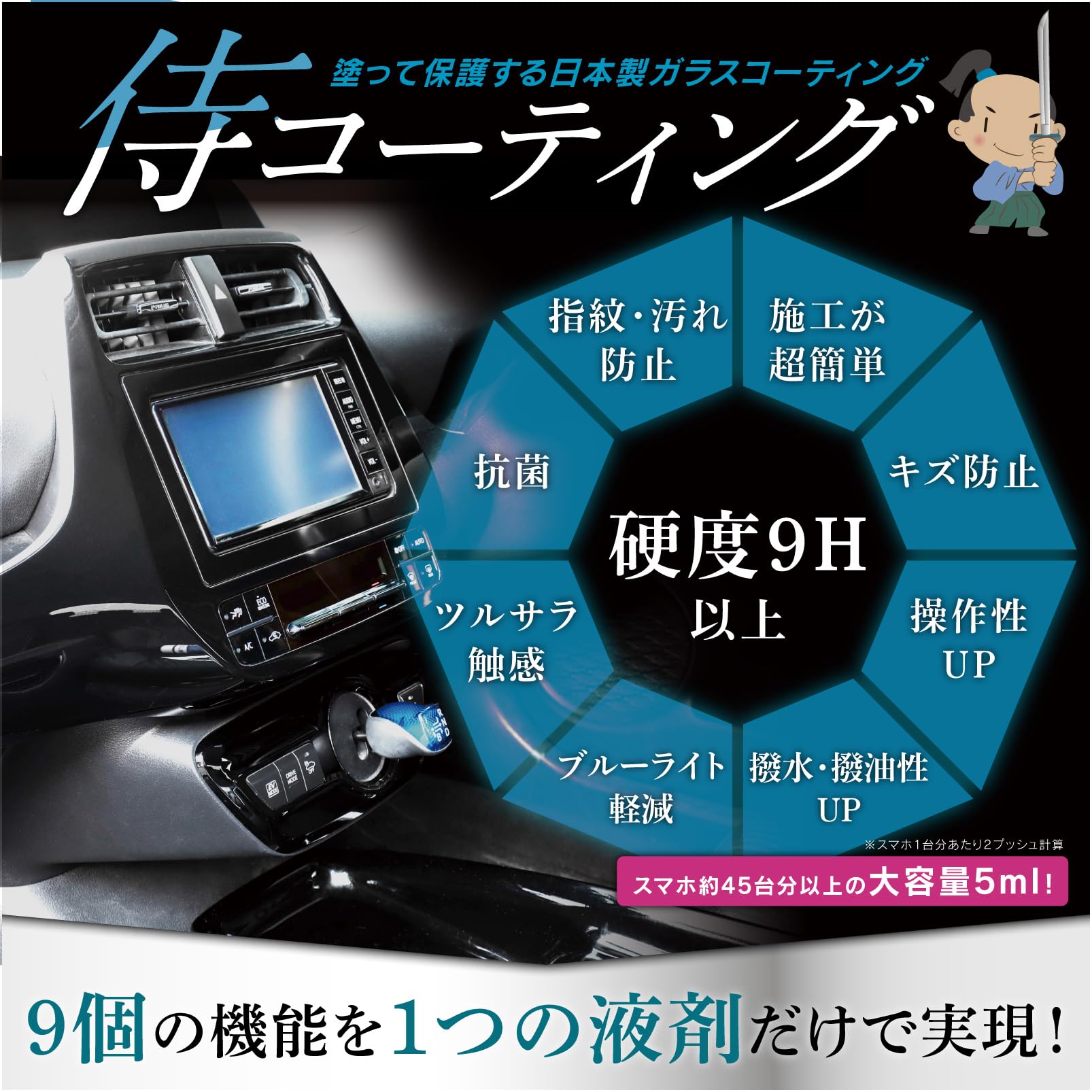 侍コーティング スマホコーティング 剤 スプレー サムライ | ガラス系 硬度9H 日本製 抗菌 指紋防止 | スマホ 車内装 ピアノブラック iPhone SE / 12 / 13 / 14 / 15 / 16 対応 | 大容量5ml ベルモンド B0912