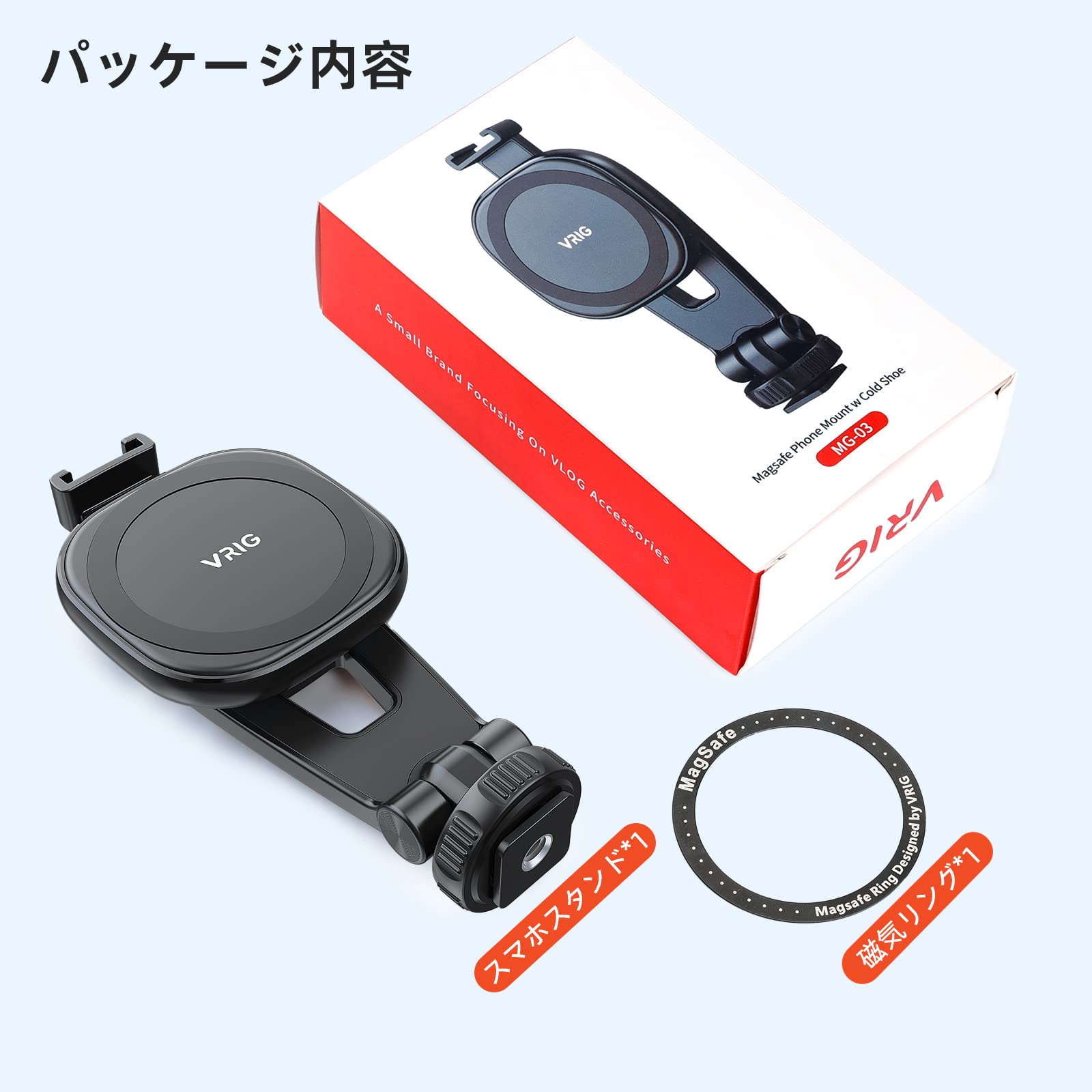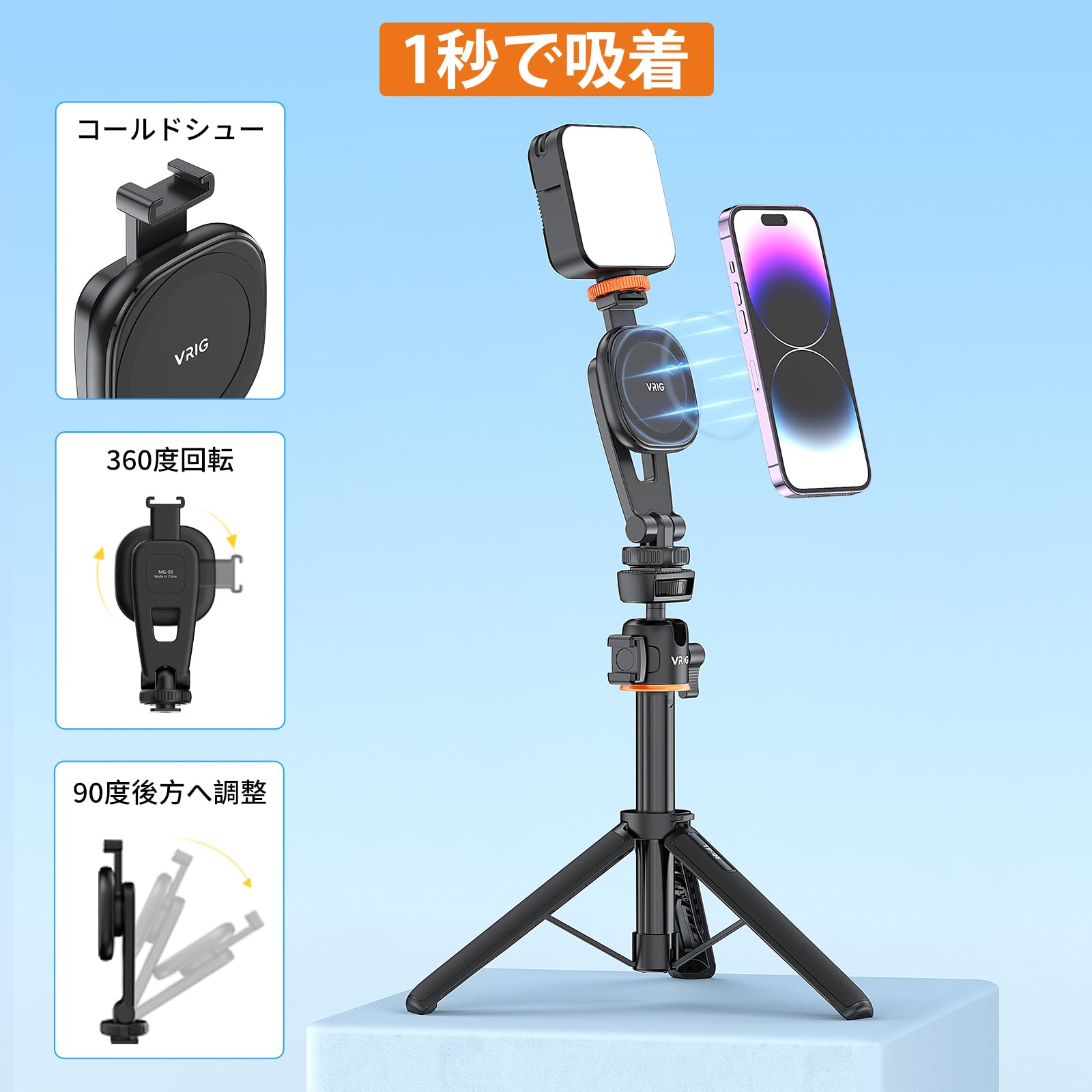 VRIG MG-03 スマホホルダー 三脚 magsafe対応 三脚マウント 片手操作 超強力磁力 コールドシュー付き スマートフォンマウント1/4インチネジ穴 iPhone/Android/自撮り棒/カメラ/ライトに対応