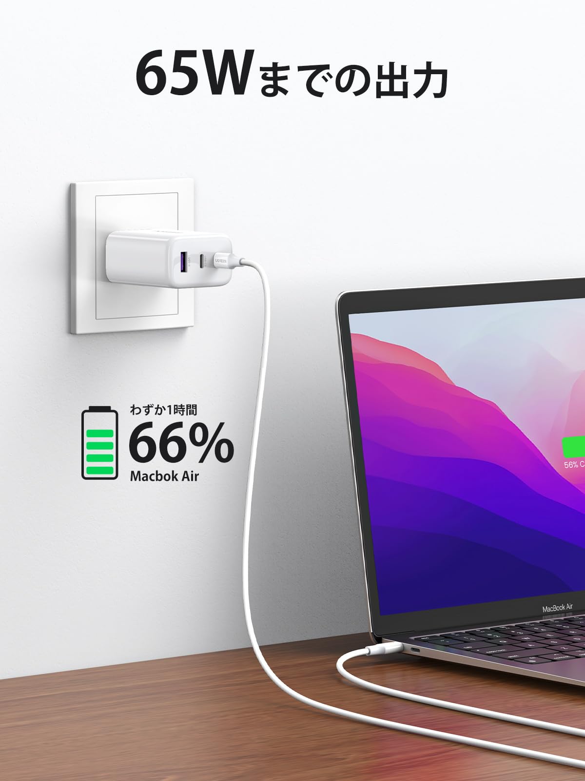 * 【65Wの高出力を持つ3-in-1急速充電器】単ポート最大65W出力、USB-C×2&USB-Aの合計3ポート搭載の急速充電器です!サイズ/重さ(約):66*40*31mm/ 130g、この1台でスマホからノートPCまで幅広い機器を充電できることが魅力的です。