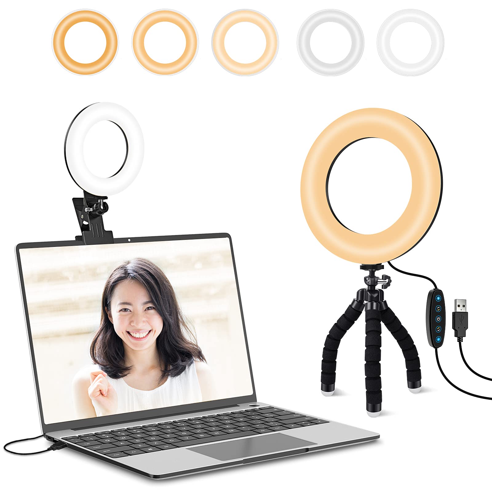 リングライト 6.3インチ【Kimwood 革新モデル】リングライト 三脚 クリップ式 女優ライト 卓上 パソコン 高輝度 5色モード リモートワーク ライト 照明 撮影 360度回転可能 USB給電 zoom/web会議/オンライン授業/ビデオ/生放送/自撮り/美容化粧/YouTube/Tik Tok/Facebook/Twitter/Instagram