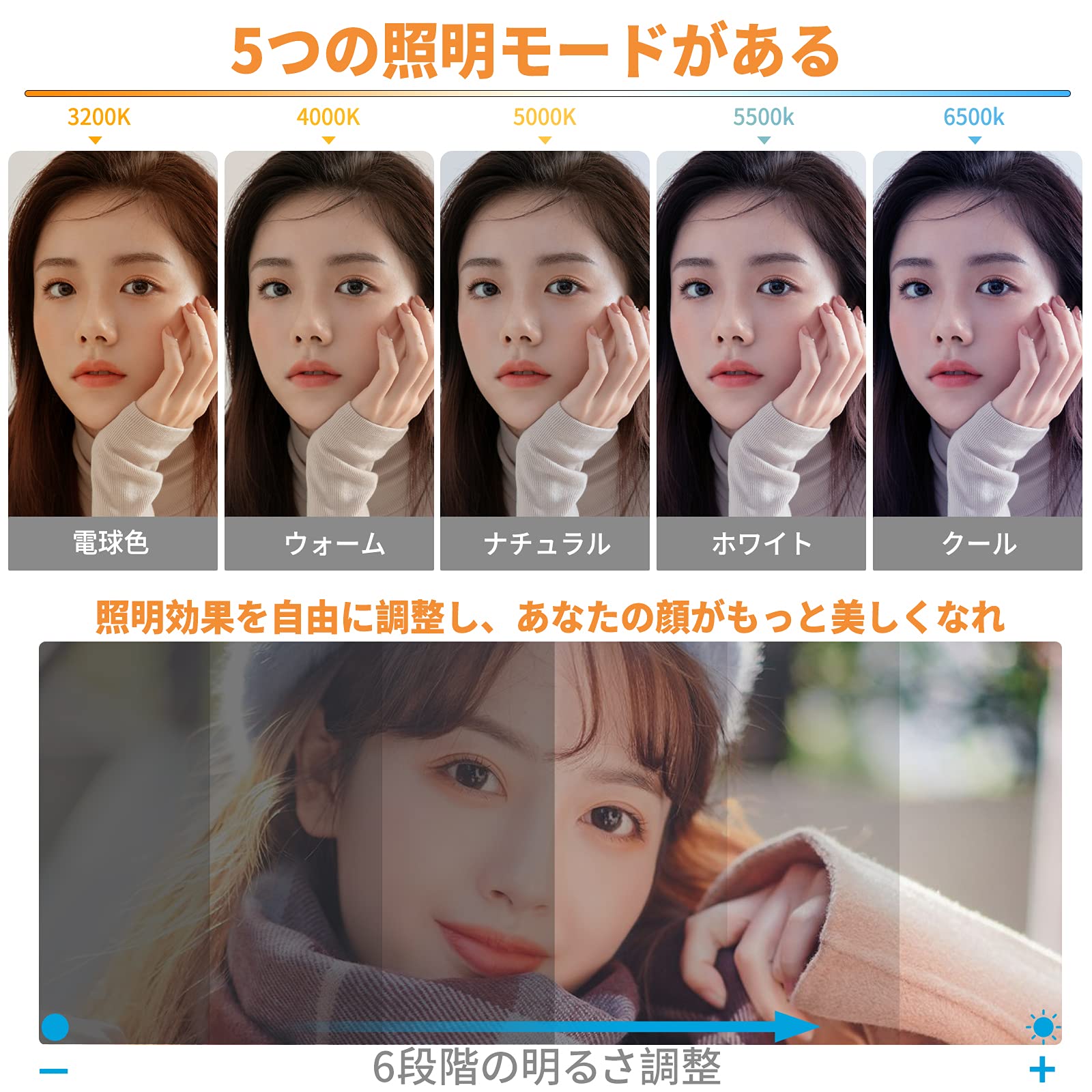 * 【お似合う五色モード·細かく調光可能】kimwoodは何千人もの人の肌をスキャンし、アジア人に最も適した五色モードのLedリングライトを開発されました。リングライトは色温度は3200Kから6500Kまで、環境や気分によって好きな照明の色合いを切り替えます。明るさは細かく調整することで不自然な白飛びを防ぐことが出来て驚きの美肌効果を発揮し、女優にように美しく綺麗に撮影録画することが出来ます。