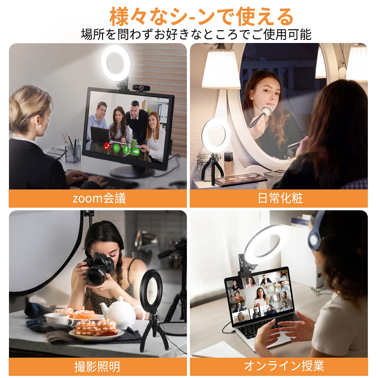 * 【多場面適用】インタネット時代では、オンラインミーティング/面接/授業、ライブ配信、Line通話の機会が増えており、明るすぎたり暗すぎたりすると目に負担がかかります。こちらのオンライン用ライトは柔らかな照明で目を保護、紫外線による肌へのダメージを減少、長時間使用してもお体に危害が出さない。電子機器をよく使う人にとっては持っておいて損はない商品だと思います。クリップ式+三脚なのでどこでも使え、リモート用ライトとしてだけでなく、自撮りライト、女優ライト、生放送用ライトとしても最適、いろんな場面でしっかり照明。