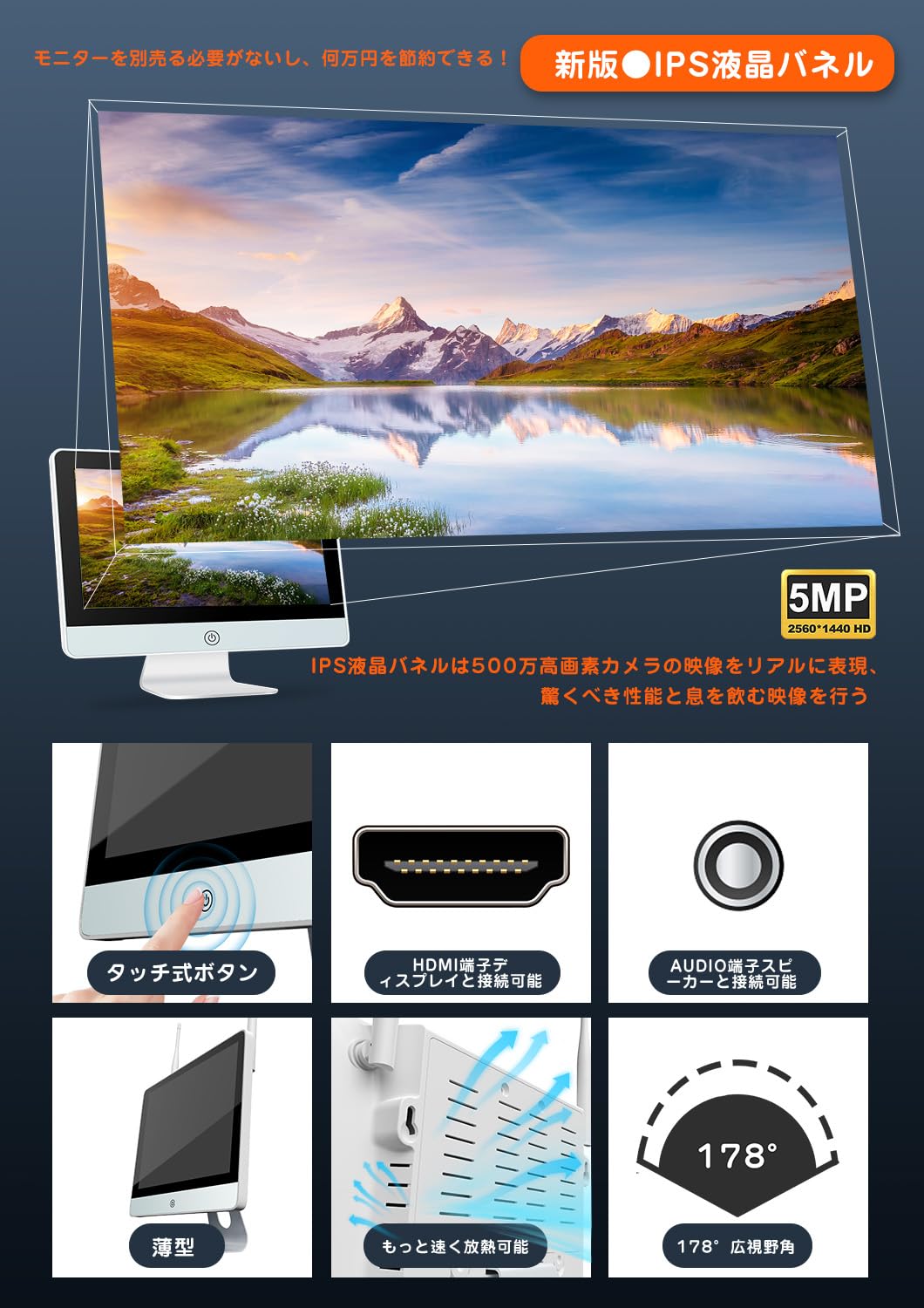 * 【PTZカメラ&新版IPS式防犯モニター】パンチルト機能が搭載し、スマホアプリから監視角度(上下0~90°左右0~355°)を自由に調節でき、死角なしで監視領域を見渡せるワイヤレス防犯カメラが登場!ドーム型なので屋外・屋内の天井や壁面も設置できます。天井に取り付けたら部屋全体を水平方向355°、垂直方向90°のパン/チルトPTZ機能で360度の全方位監視ができます。視野角を上下左右に映せるため、4台セットは従来の防犯カメラの数台分の防犯が可能になり、死角のない映像を録画できます。防犯モニターは液晶モニターと録画機が一体になっているので、別途にモニターを用意する必要がありません。一体型PCと類似のデザインので、オシャレで立派ですし。更に筐体がコンパクトで直感的に、持ち運びしやすいです。また、HDMI端子付き、HDMIケーブルを使用してご自宅のテレビ(1080P以上の場合)に接続して、もっと大画面で動画を楽しめます。
