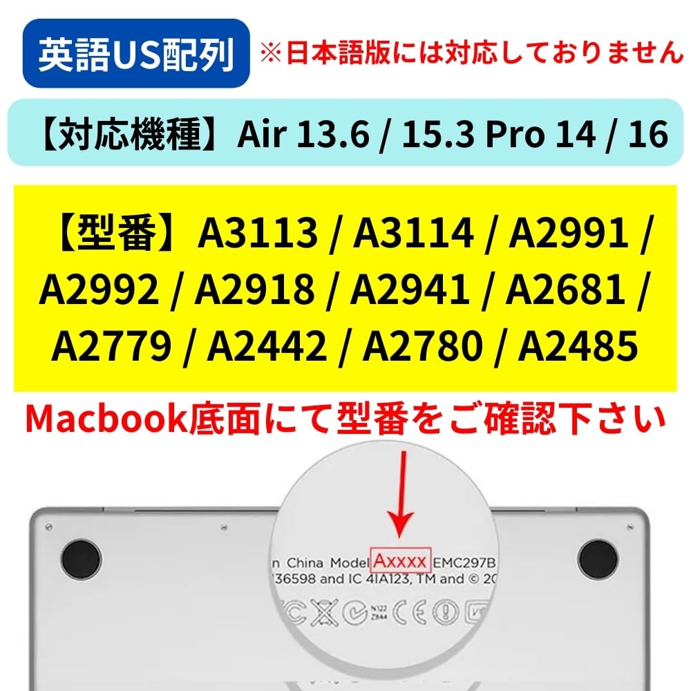 * 【対応機種】Macbook Air 15.3 ( 2024 - 2022 ) Macbook Air 13.6 ( 2021 - 2024 ) M3 M2 Pro Max チップ Macbook Pro 14 / Pro 16 インチ 対応 英語US配列 キーボードカバー