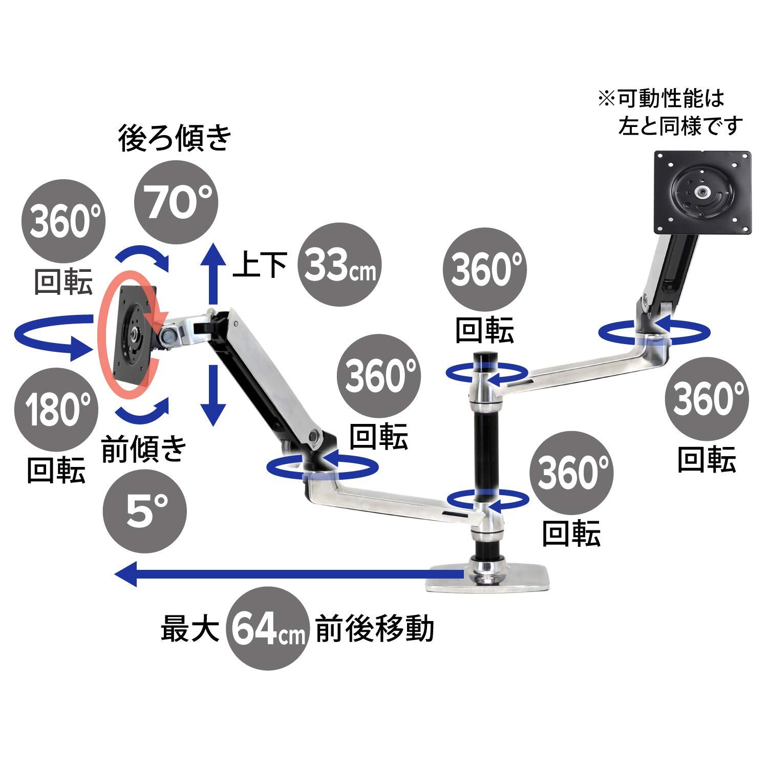 ERGOTRON エルゴトロン LX モニターアーム デスクマウント デュアル 縦/横型 2画面 シルバー 24インチ(6.4~18.1kg)まで VESA規格対応 ノートPC用アクセサリ付属 45-248-026