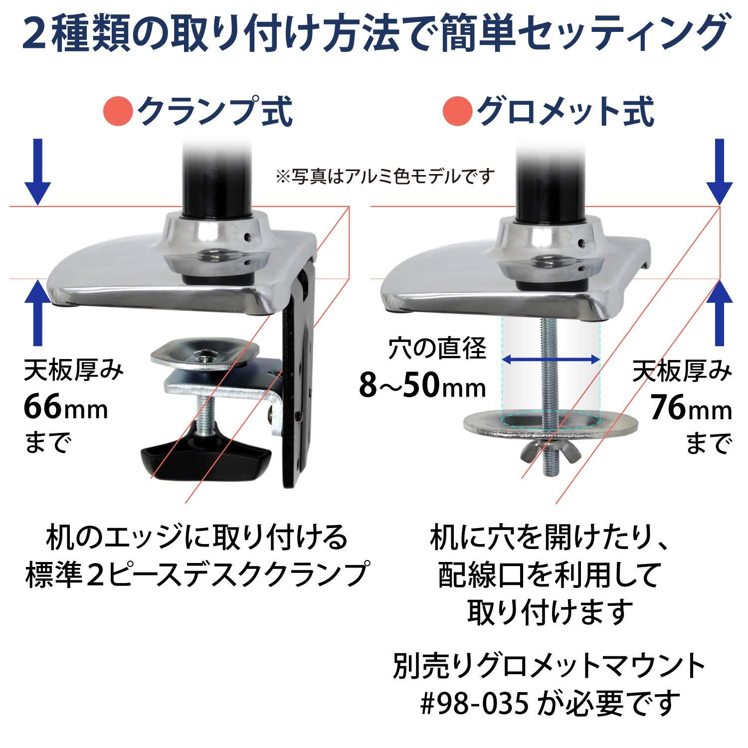 ■ デスククランプは66mmまでの厚さ、グロメットマウントは直径8~50mmの穴、76mmまでの厚さに取り付け可能。