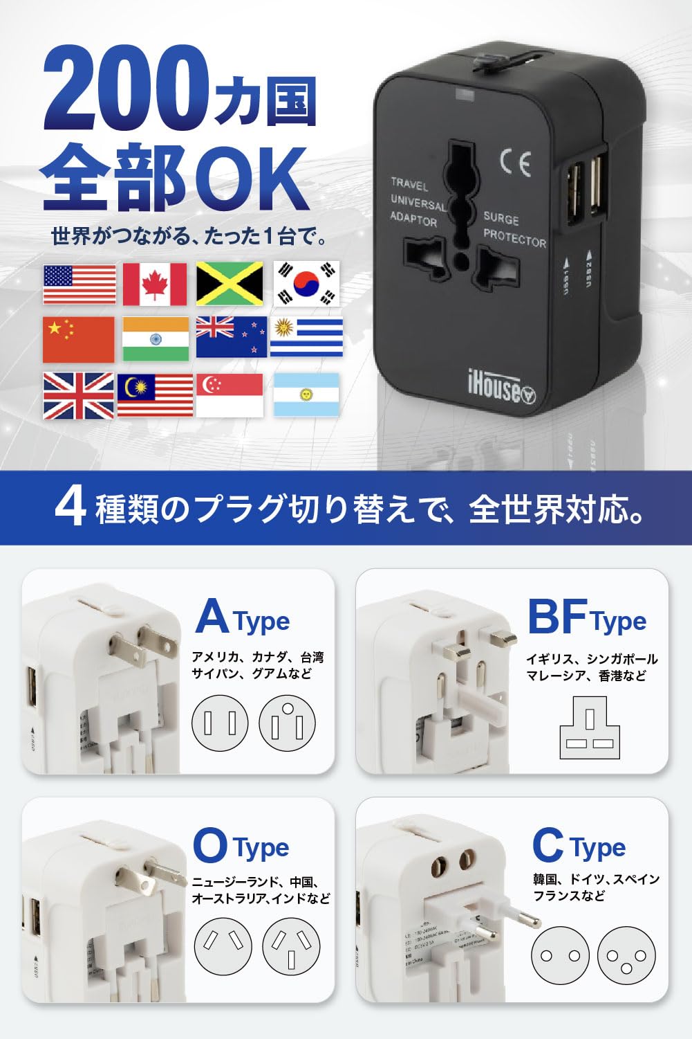 iHouse all 海外変換プラグ 2USBポート マルチアダプター A/O/BF/C対応 全世界対応 旅行用充電器 経済産業省承認 正規保証1年 (ホワイト)