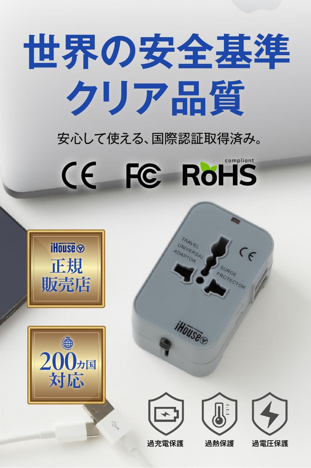 韓国、中国、アメリカ、イギリス、ヨーロッパなど、世界200カ国以上のプラグに対応します。