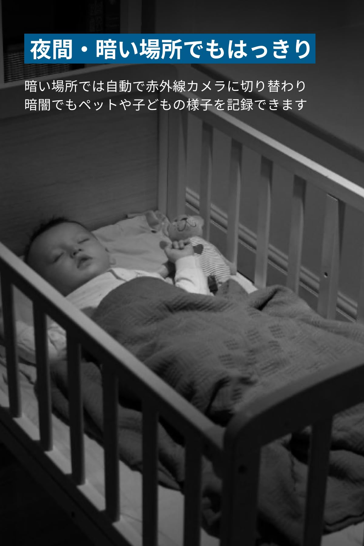 ⾃動夜間モードを搭載し、暗い部屋でもクリアな映像で、⾒守りや防犯対策に最適です。