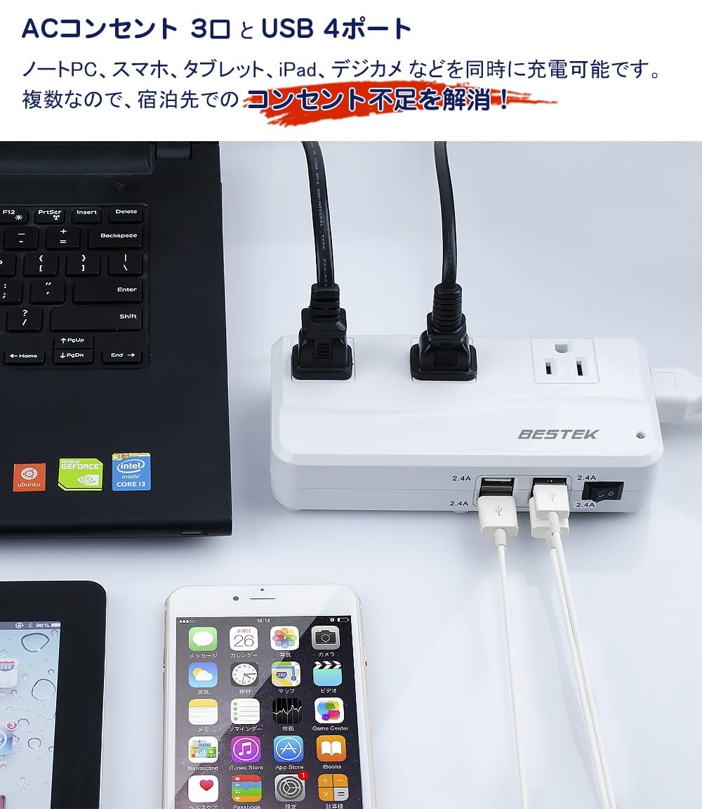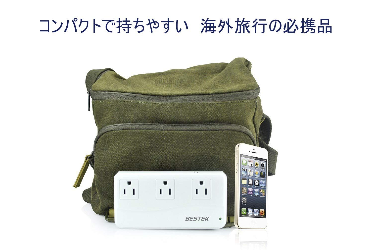 ベステック 海外旅行用変圧器 海外 コンセント 変圧器 90V-240V to 100V 変換 ACコンセント 3口 + USB 4ポート 変換プラグ 付き A B BF C O O2 B3 SE プラグ対応 MRJ201GU-WH