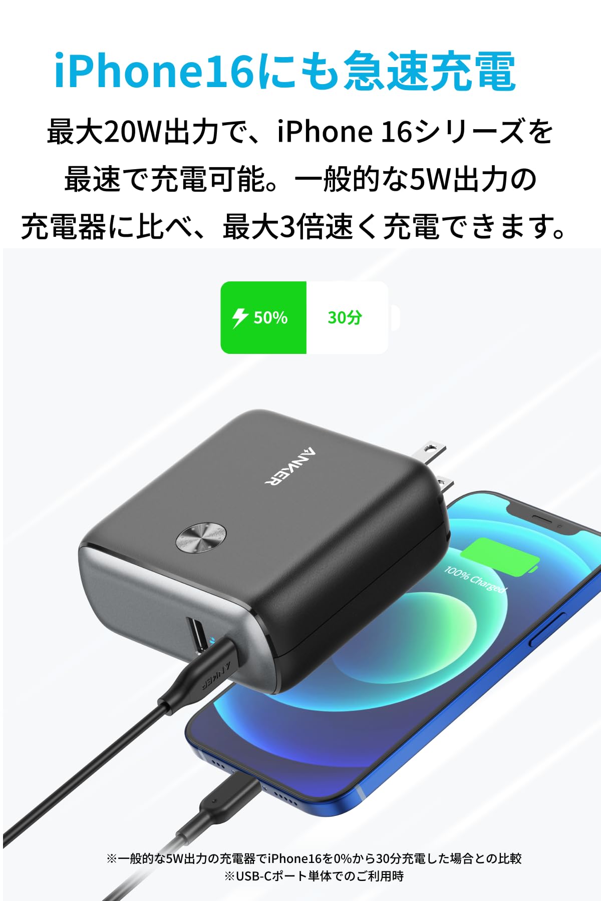 ■ iPhone 16にも急速充電:最大20W出力で、iPhone 16シリーズを最速で充電可能です。