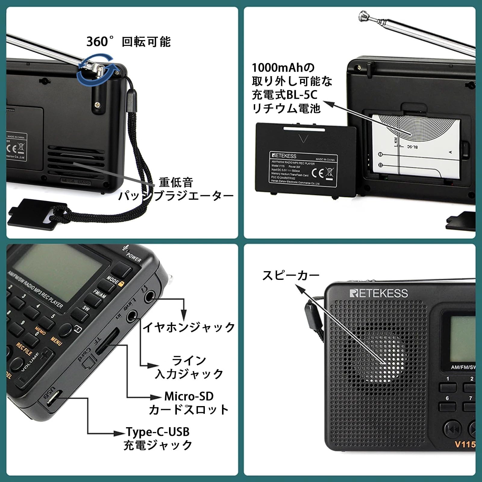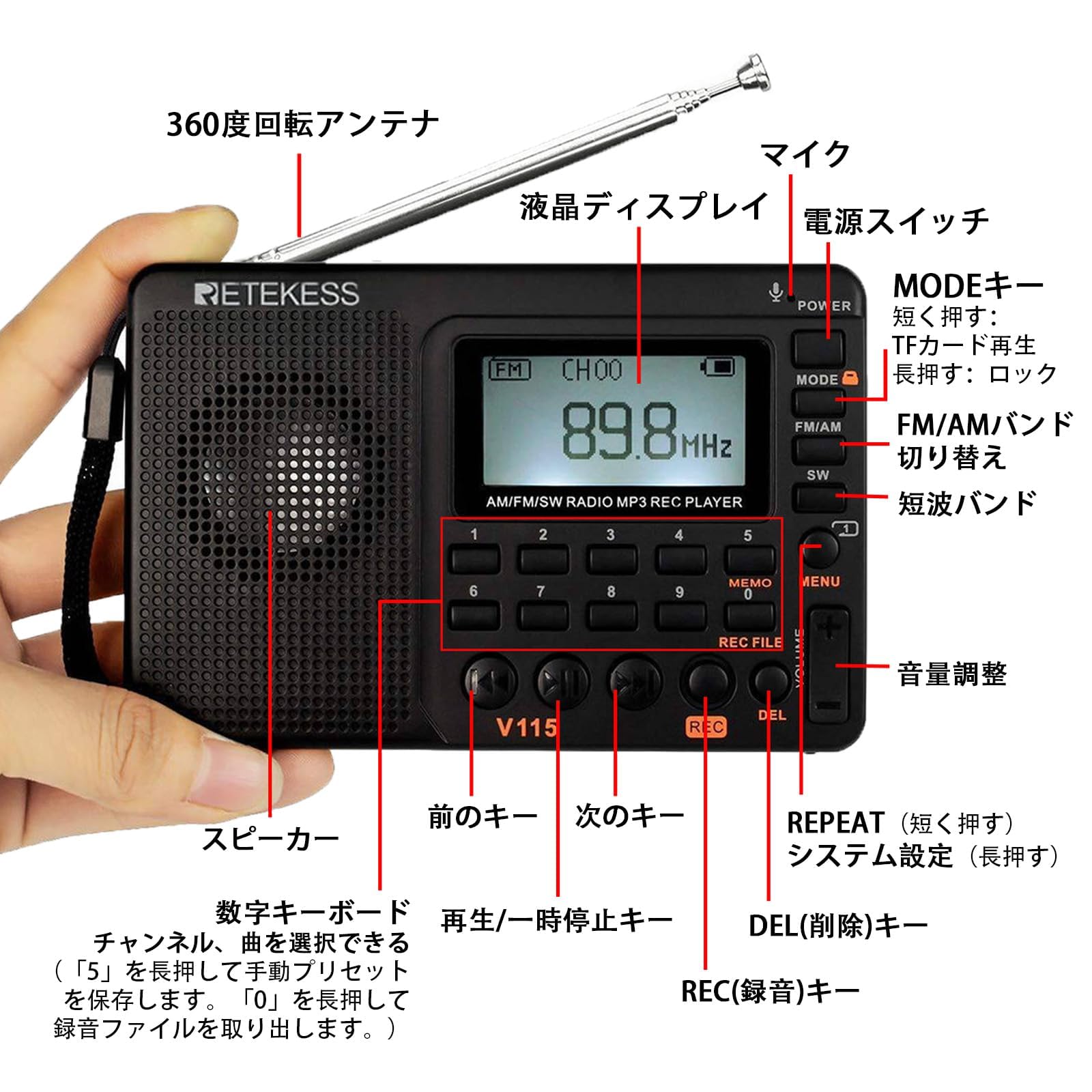 Retekess V115 小型短波ラジオ AM/FM/SW ポータブルラジオ USB-C充電式 Micro SDカード MP3ステレオ 日本語対応 アマチュア無線愛好家向け 高感度 防災 スリープタイマー 録音機能 RECボイスレコーダー 両親への贈り物 敬老の日 プレゼント