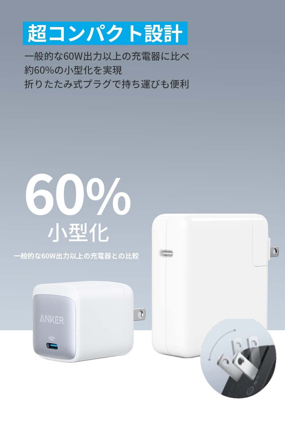■ 超コンパクト設計:一般的な60W出力以上の充電器に比べ約60%小さなコンパクトサイズを実現。