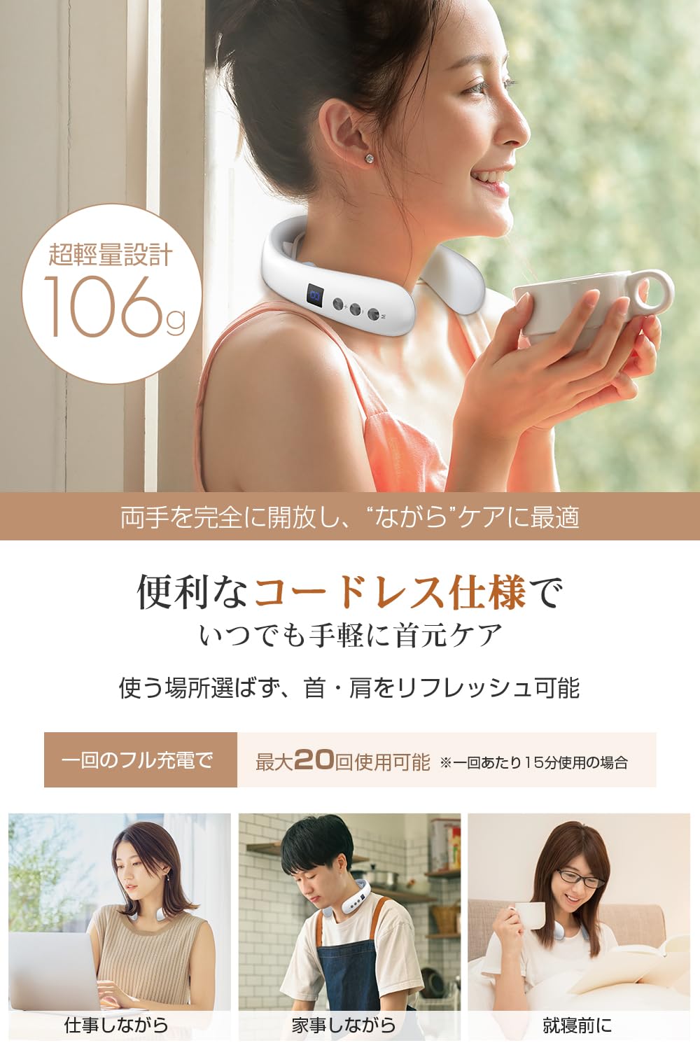 * 【人間工学に基づいたフィット感&超軽量】柔軟性のあるフレーム採用と隙間ができにくい設計を採用することで、抜群のフィット感を実現しました。本体は小型で、動いてもズレない快適な着け心地を実感できます。重量もわずか約106gと超軽量、首に余計の負担をかけずに使用ができるリラックス グッズです。