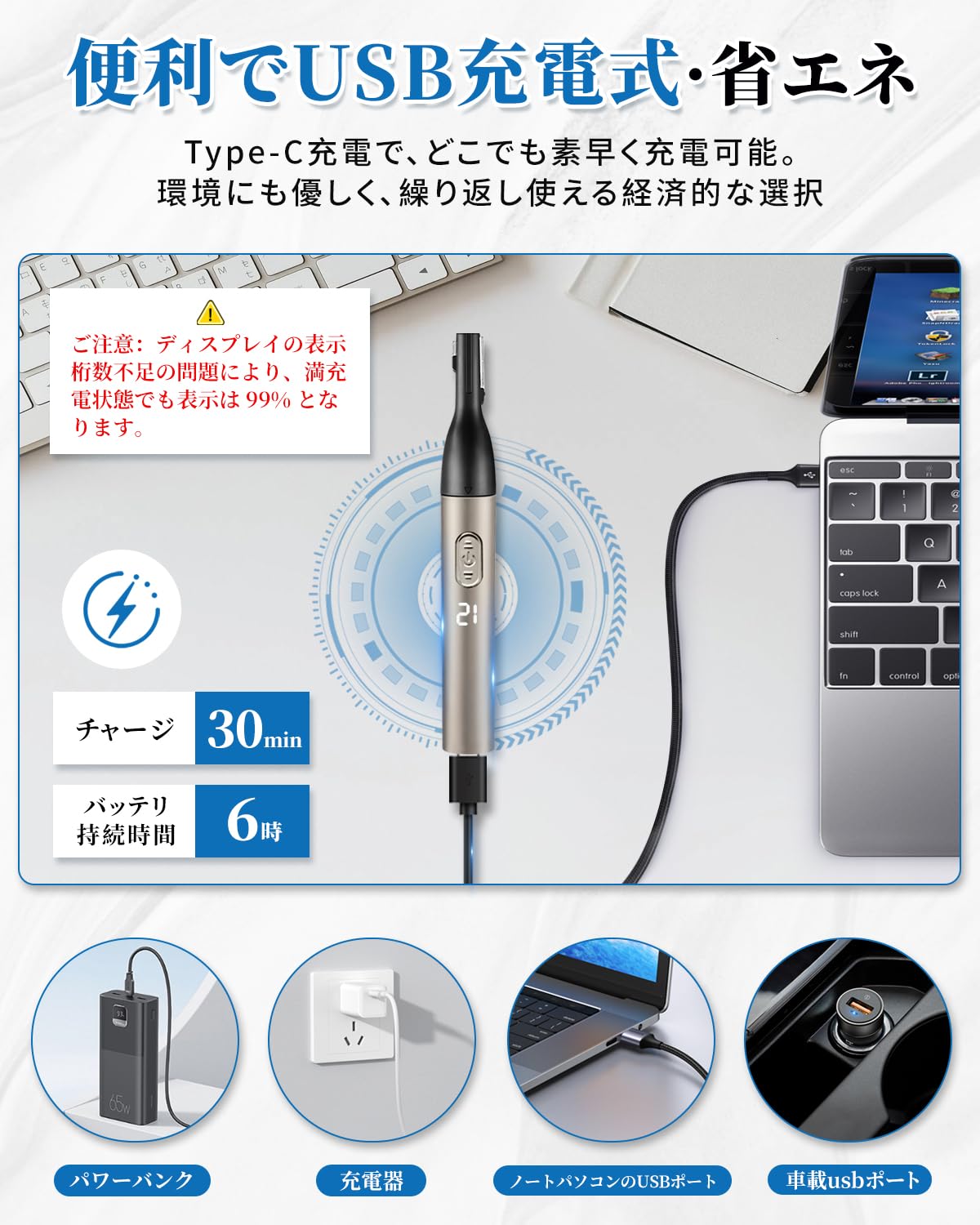 * 【LCD画面 & USB充電式電動シェーバー】デジタルLCDスクリーンを搭載したので、いつでも電力残量を把握することができ、途中で停電する心配がなく、使用体験をアップします。USB充電ポートの独自の設計を使い、過電圧、過充電、短絡を防止し、安全性を向上させる同時に、充電速度を大幅に向上し、満タン充電はわずか30分です。