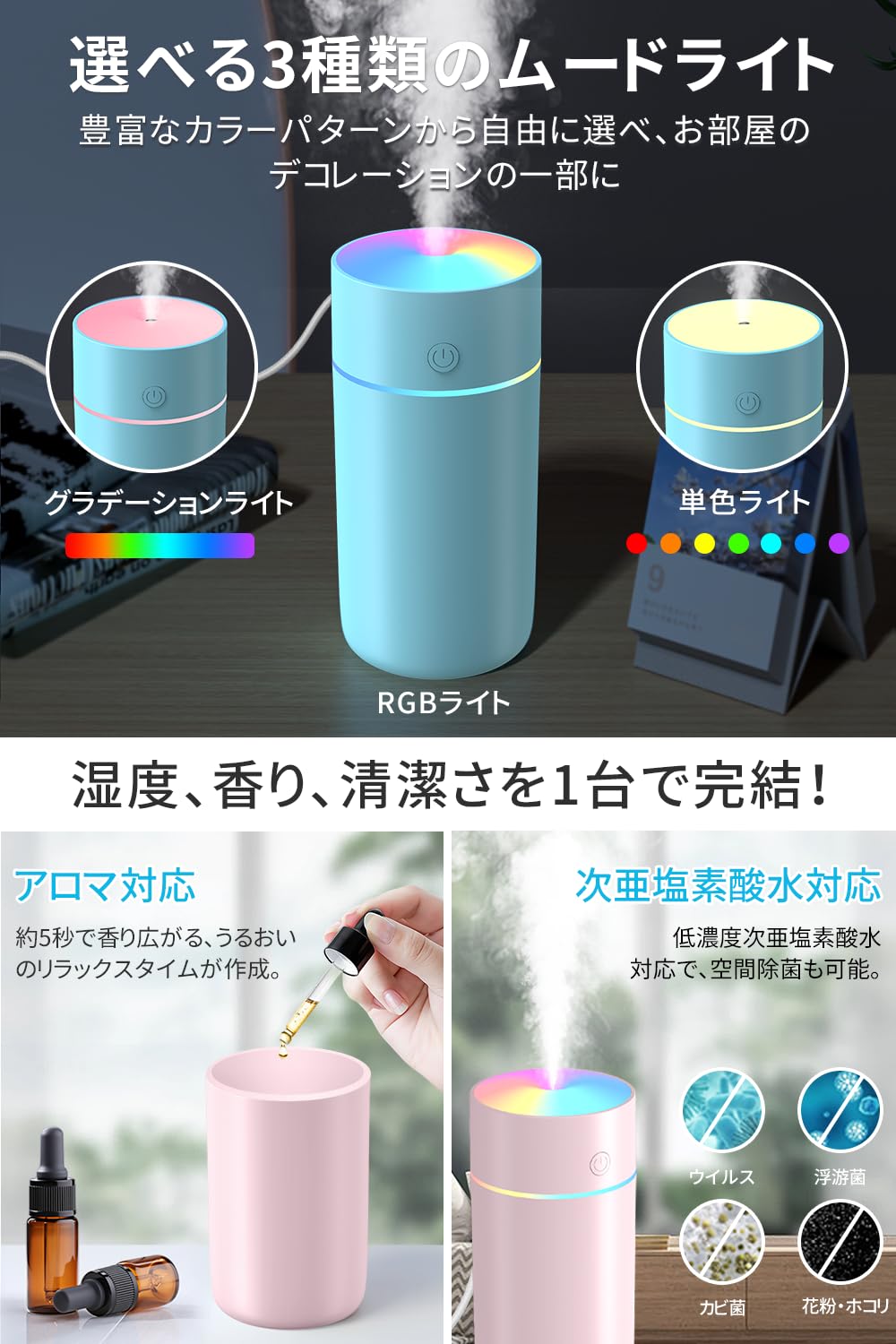 * 【多用途対応&衛生的設計】 持ち運びが便利で、オフィス・寝室はもちろん、車内や外出先でも活躍! アロマオイル(2ml以下)や次亜塩素酸水(50ppm以下)に対応し、香り楽しみながらウイルス対策も。水漏れ防止構造でデスク上でも安心。長時間使用してもカビナイので、お手入れも簡単。