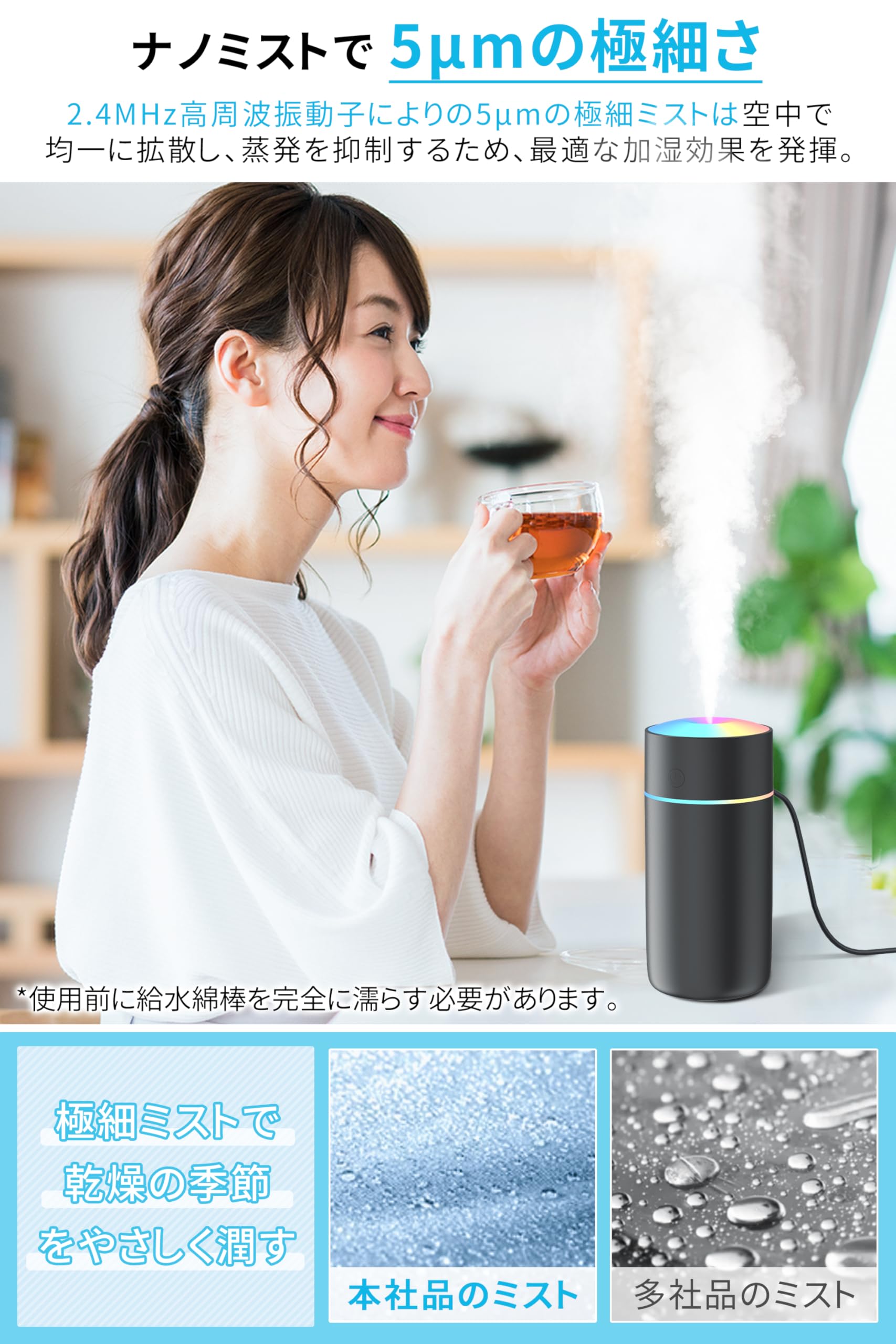 * 【超音波式&卓上コンパクト設計】 新技術採用の超音波式加湿器が、約5μmの超微細ミストを噴出。浸透力が高く、秋冬の肌や唇の乾燥を効率的にケアします。ペットボトルサイズの小型加湿器で、デスクやオフィスの限られたスペースでも邪魔になりません。寝室の枕元や車内でも手軽に設置でき、ポータブル加湿器としての利便性が魅力。