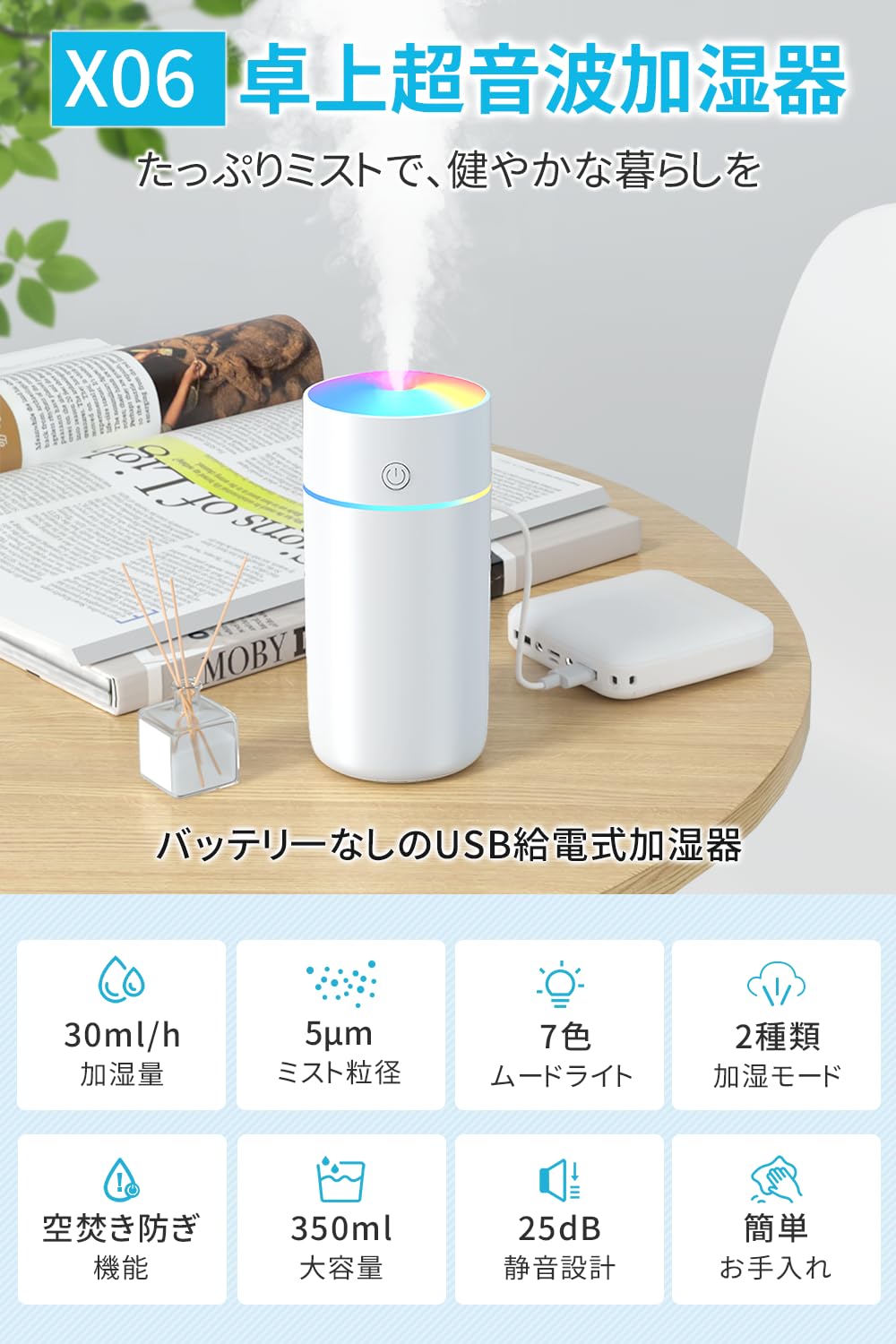 * 【USB給電&静音省エネ】 USB給電でモバイルバッテリーや車載充電器にも接続可能で、車載時も含めあらゆるシーンで電源確保がラクチンです。消費電力はわずか2W(1日約1円)、改良版超音波技術で動作音約25dBを実現。静音設計により、オフィスでの集中作業や寝室・枕元での安眠を邪魔しません。携帯加湿器としての実用性を強化。