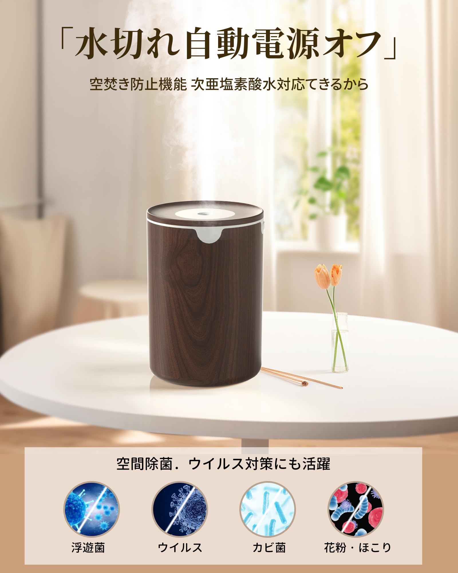 【2025新進化モデル加湿器・木目調】加湿器 小型 卓上 除菌 アロマ対応 LEDライト 超音波式 静音 卓上 自動停止機能 空焚き防止 お手入れ簡単 6畳対応 デスク 寝室 オフィス 車用 リビング 次亜塩素酸水対応 乾燥/花粉症対策(ブラウン)