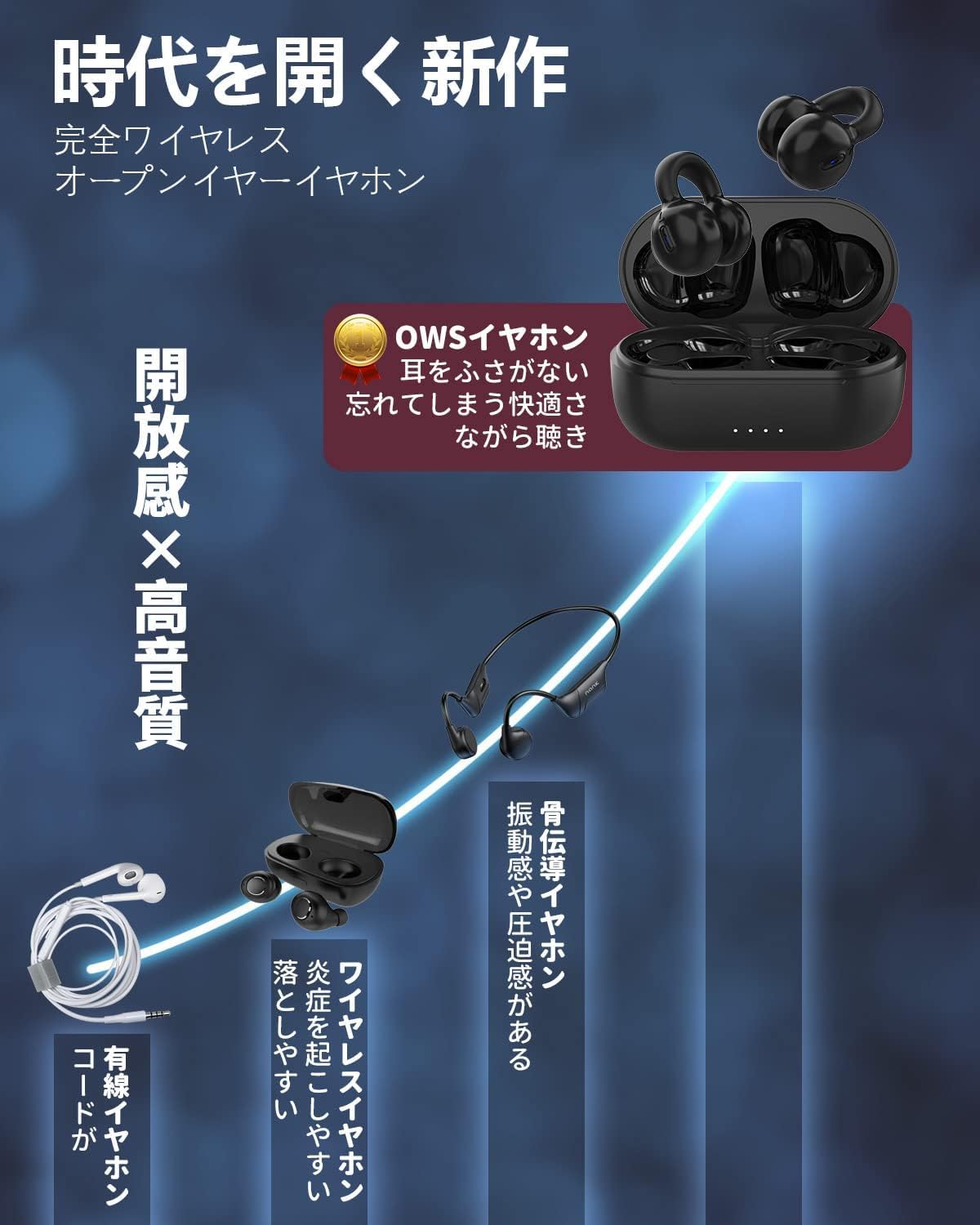 【時代を開く OWSイヤホン】 Bluetooth 「イヤーカフ」型 完全ワイヤレス bluetooth 5.3 マイク付き 骨伝導より快適 耳を塞がない 耳挟み式 空気伝導 ブルートゥース ENCノイズキャンセリング 日本語音声ガイド/日本語取扱説明書/5g超軽量/自動ペアリング/ハンズフリー通話/プレゼントに最適