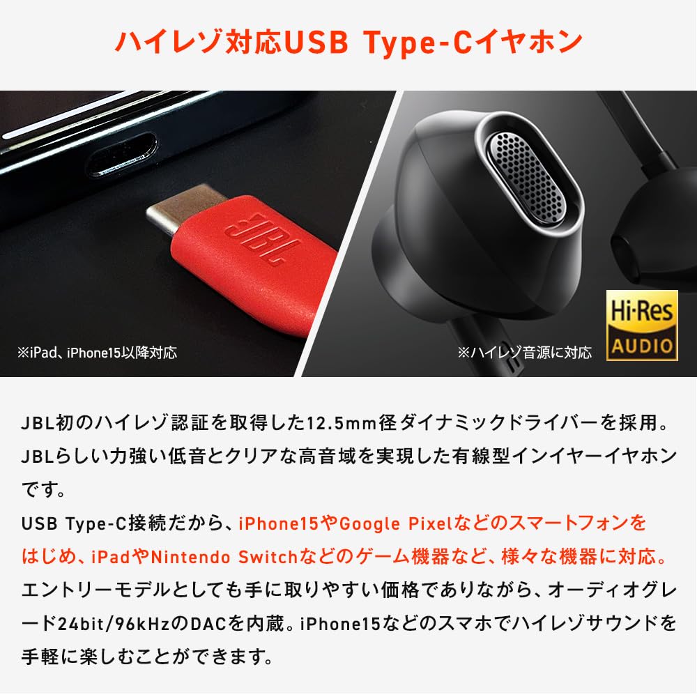 JBL TUNE 305C 有線インイヤーイヤホン ハイレゾ 96 kHz/24 bits プリセットEQ USB Type-C 12.5mmダイナミックドライバー オープンタイプイヤホン マイク内蔵 フラットケーブル (ホワイト)
