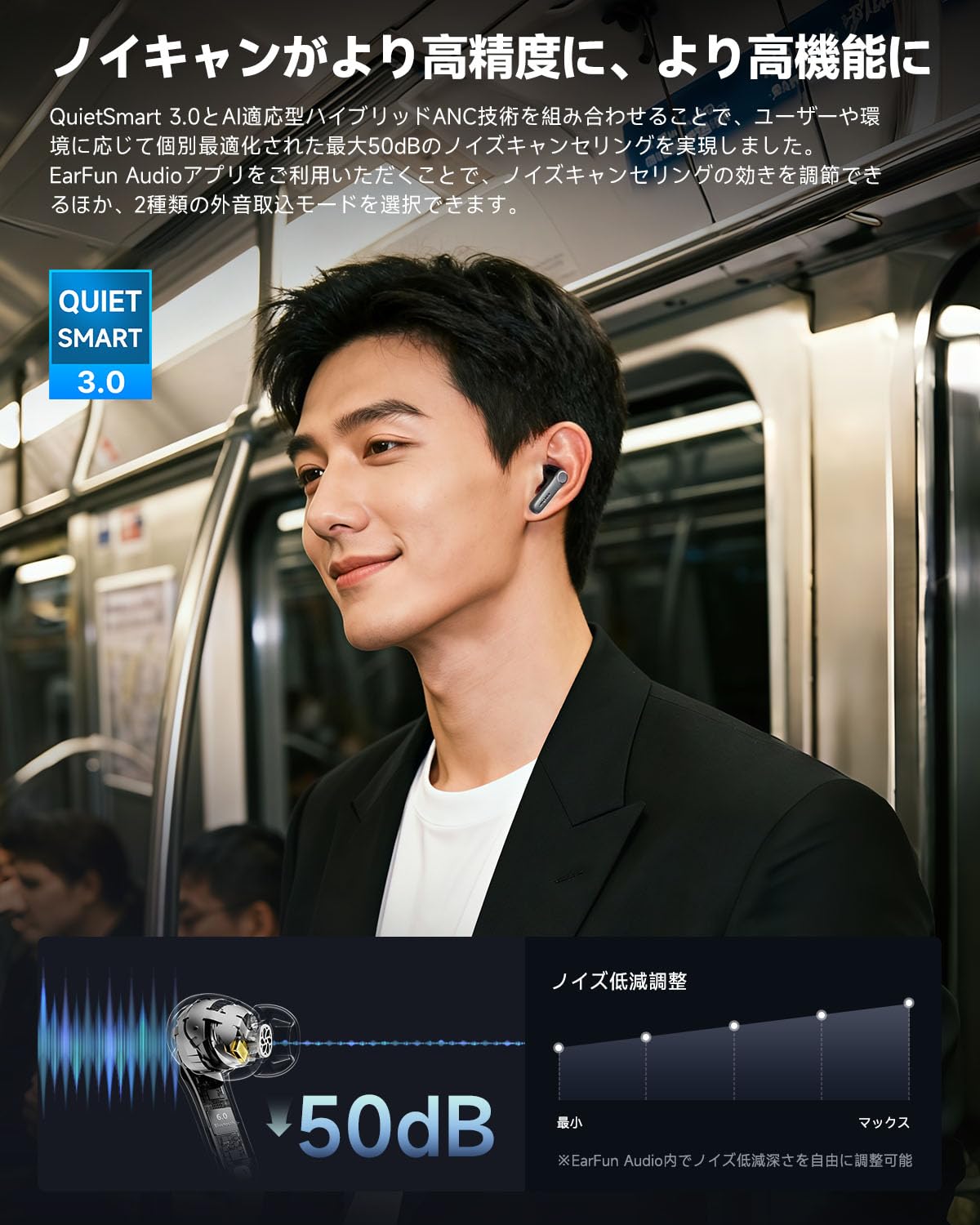 ■ 【AI適応型ノイズキャンセリング & 装着検出機能】QuietSmart 3.0とAI適応型ハイブリッドANC技術を組み合わせることで、ユーザーや環境に応じて個別最適化された最大50dBのノイズキャンセリングを実現しました。