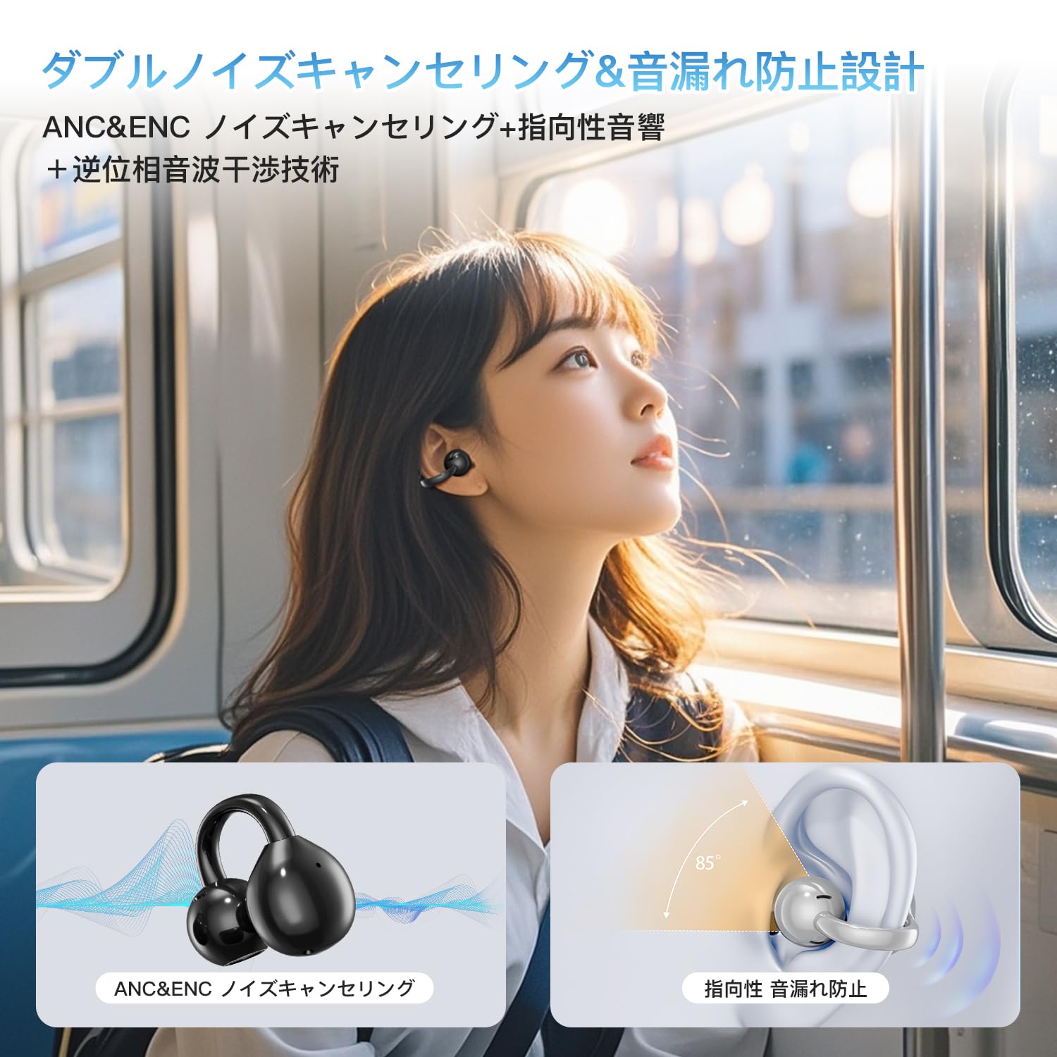 ワイヤレスイヤホンbluetooth【ANC+ENC対応・多機能タッチスクリーン・耳を塞がない】イヤーカフ Bluetooth5.4技術 Hi-Fi音質 ノイズキャンセリング AI通話 オープンイヤー 耳挟み型 音漏れ防止 ブルートゥース 48時間再生時間/IPX7防水/マイク付き/Type-C充電/小型/軽量 iPhone/Android/Pad適用 スポーツ/通勤/WEB会議 (幻夜黒)