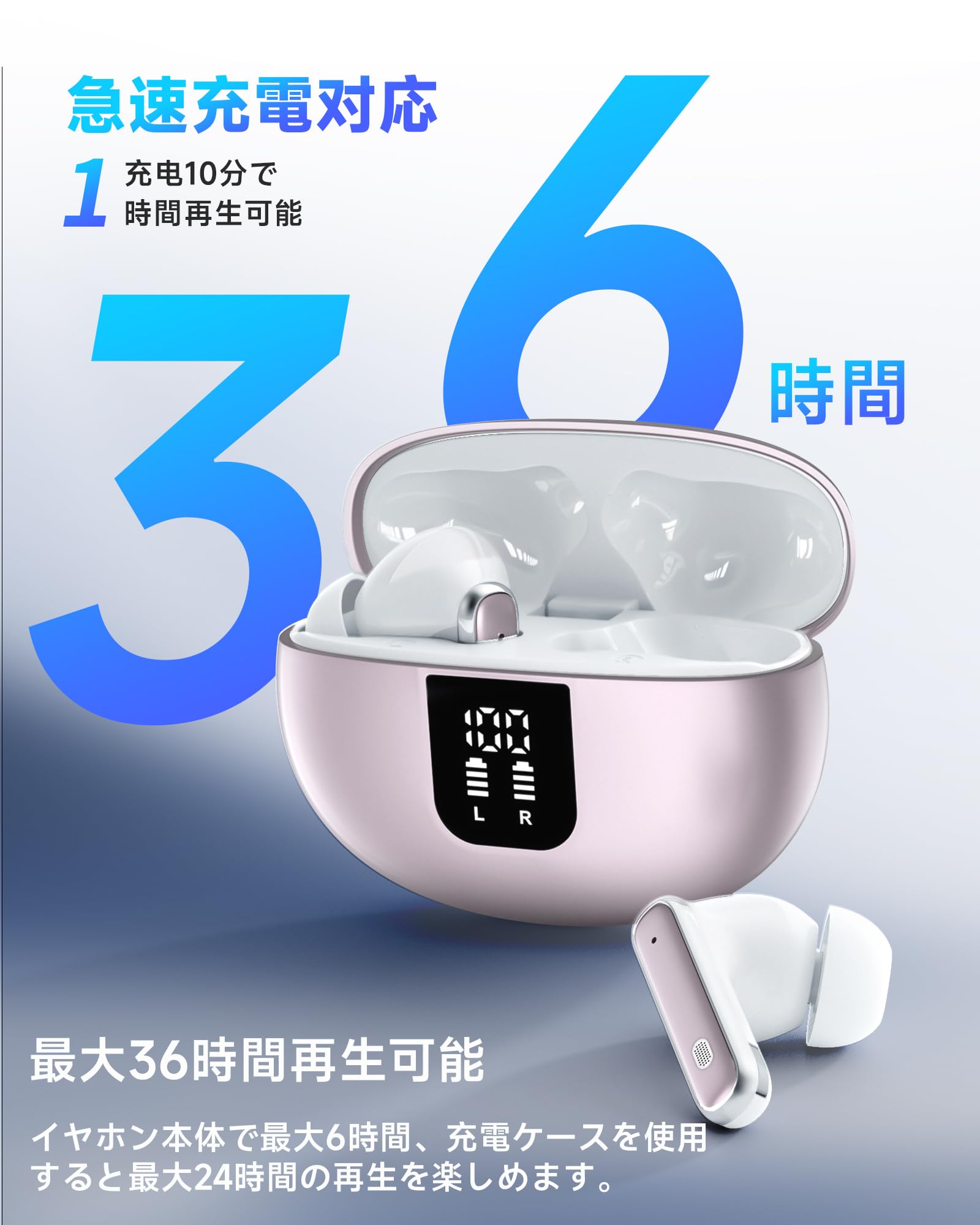 イヤホン Bluetooth ワイヤレスイヤホン AIスマート 2026年最新Bluetooth6.1 HiFi音質 ブルートゥースイヤホン 最大36時間再生 LEDディスプレイ Type-C充電 IPX7防水 小型/軽量 iOS/Android適用 WEB会議通勤/通学/スポーツ/音楽/ゲーム ブラックヘッドフォン(ローズゴールド)