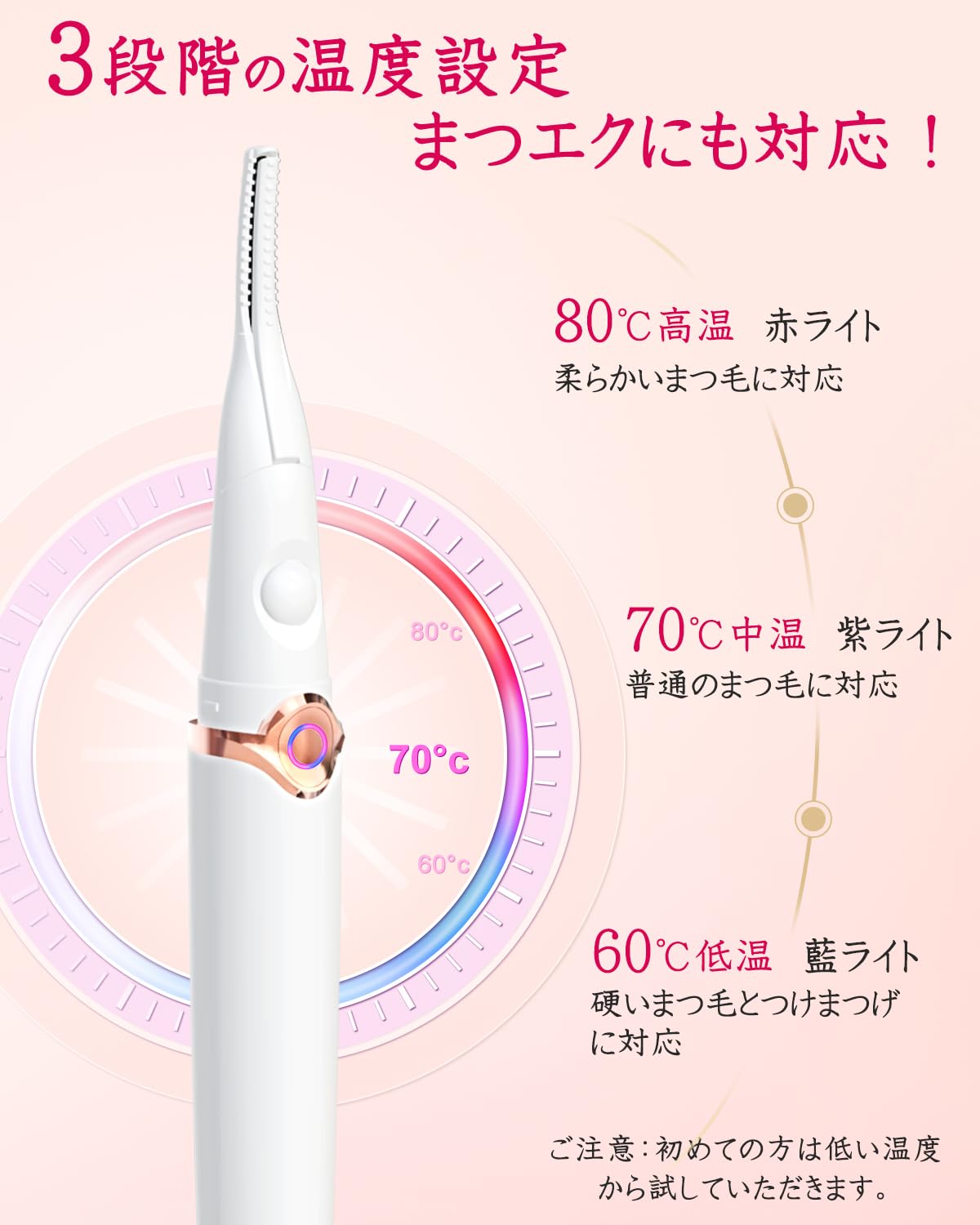 * 【3段階温度調節&10秒急速予熱】1段階のホットビューラーと比べると3段階温度あるまつげビューラーは電源部分の色で温度が確認でき、60度から80度までの温度設定が可能です。柔らかなまつ毛から硬いまつげなど、様々なまつげに対応できます。※初めての方は低い温度から試していただき、お好みの温度で使用してください。また、まつげカーラーは高性能で高熱伝導性の特殊ICチップを内蔵しており、予熱も約10秒で急速完了します。お忙しい朝でもまつ毛がぐいっと上がり、魅力的なアイメイクに仕上がります。