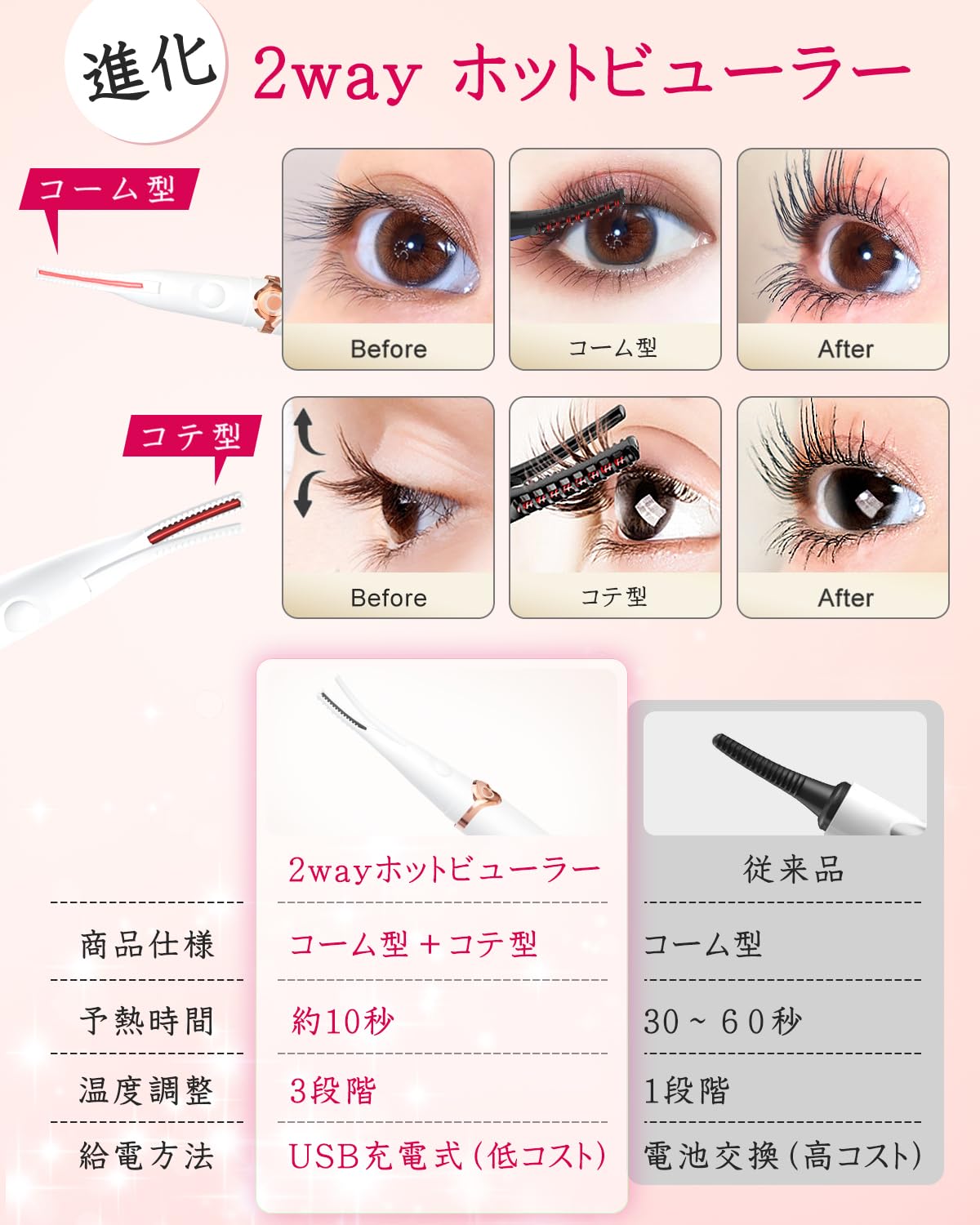 * 【進化的2Wayタイプ!温熱効果で作る究極の美カール】市販のまつげビューラーと違い、このホットビューラーはつけまつげ、自まつげ両方に使用できる2Wayタイプです。クリップでつけまつげと自まつげともはさんで、一体感のあるナチュラルな仕上がりにする一方、根元ギリギリに弧型コームを当てることでカールも作ります。さらに、マスカラと併用してよりカールアップさせることができます。※まつ毛の上がり方には、毛量・毛質・長さなど個人差がございます。