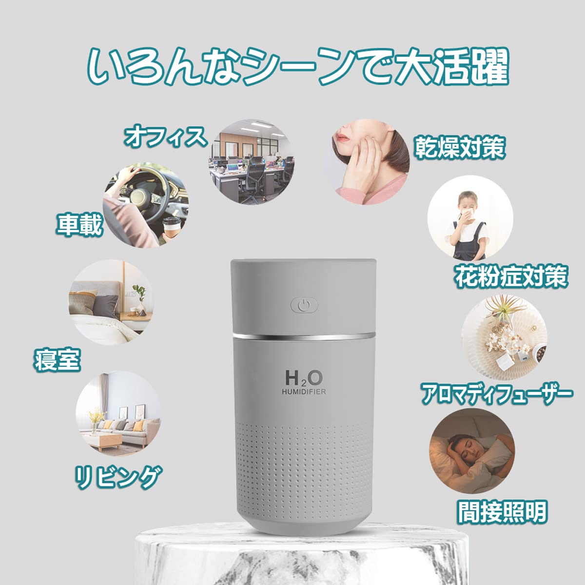 * 【いろんなシーンで大活躍】 ①部屋や車の湿度を一定に保ち、喉のイガイガや目の乾燥を防ぎます。 ②髪の毛を保湿し、肌のかさつきやツッパリ感のも防ぎます。 ③風邪やインフルエンザの原因となる花粉やハウスダストの浮遊の抑制しており、ご家族を守ります。 ④暖房時の体感温度を上げます。 ⑤静電気が嫌だから静電気を防ぎます。 ⑥夜の間接照明としても役に立ちます。 ⑦アロマの香りやマイナスイオンを出して快適に過ごします。