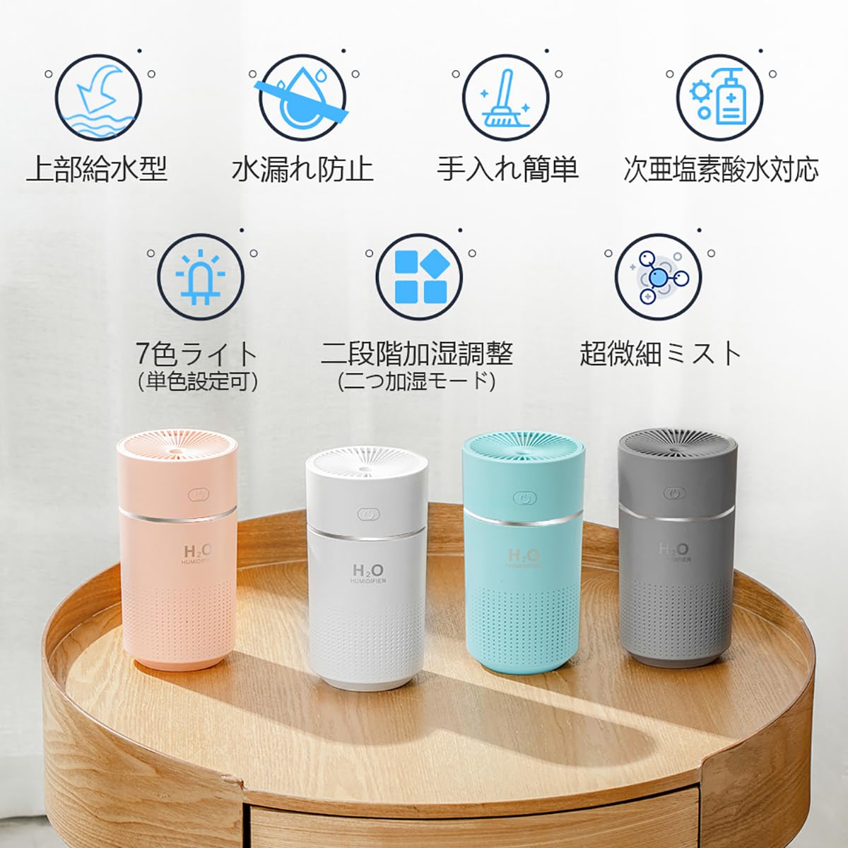 * 【超微細ミスト】 ハイパワー振動子による超微細ミストで加湿効率をアップします。 【二段階加湿調節】 強モード/持続加湿モードと弱モード/断続加湿モードの二段階で加湿量が調節できます。 【やさしいライト】 7色ライトを搭載します。グラデーションで変化することも単色に設定することもできます。ライトを消すことも可能。 【次亜塩素酸水対応】 50ppm以下の次亜塩素酸水を使用することができます。