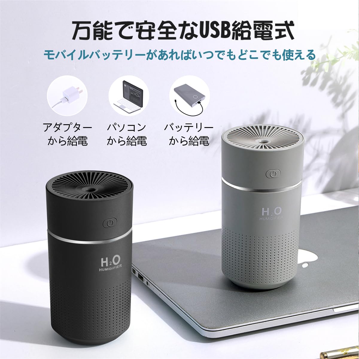 * 【便利で安全なUSB給電式】 本品はUSB給電式を採用しており、アダプターだけでなく、パソコンやモバイルバッテリーからも電源がとれるからどこでも使いやすいです。 さらに、充電式加湿器(運転時間が2、3時間だけなのに充電時間はそれ以上、電源を繋ぎっぱなしに使用するのも過充電が気になる)とは違い、 こちらの給電式加湿器は過充電がないので安全性が高く、大容量モバイルバッテリーと併用すれば運転時間を20時間以上大幅に延ばせるので便利性も高くなります。