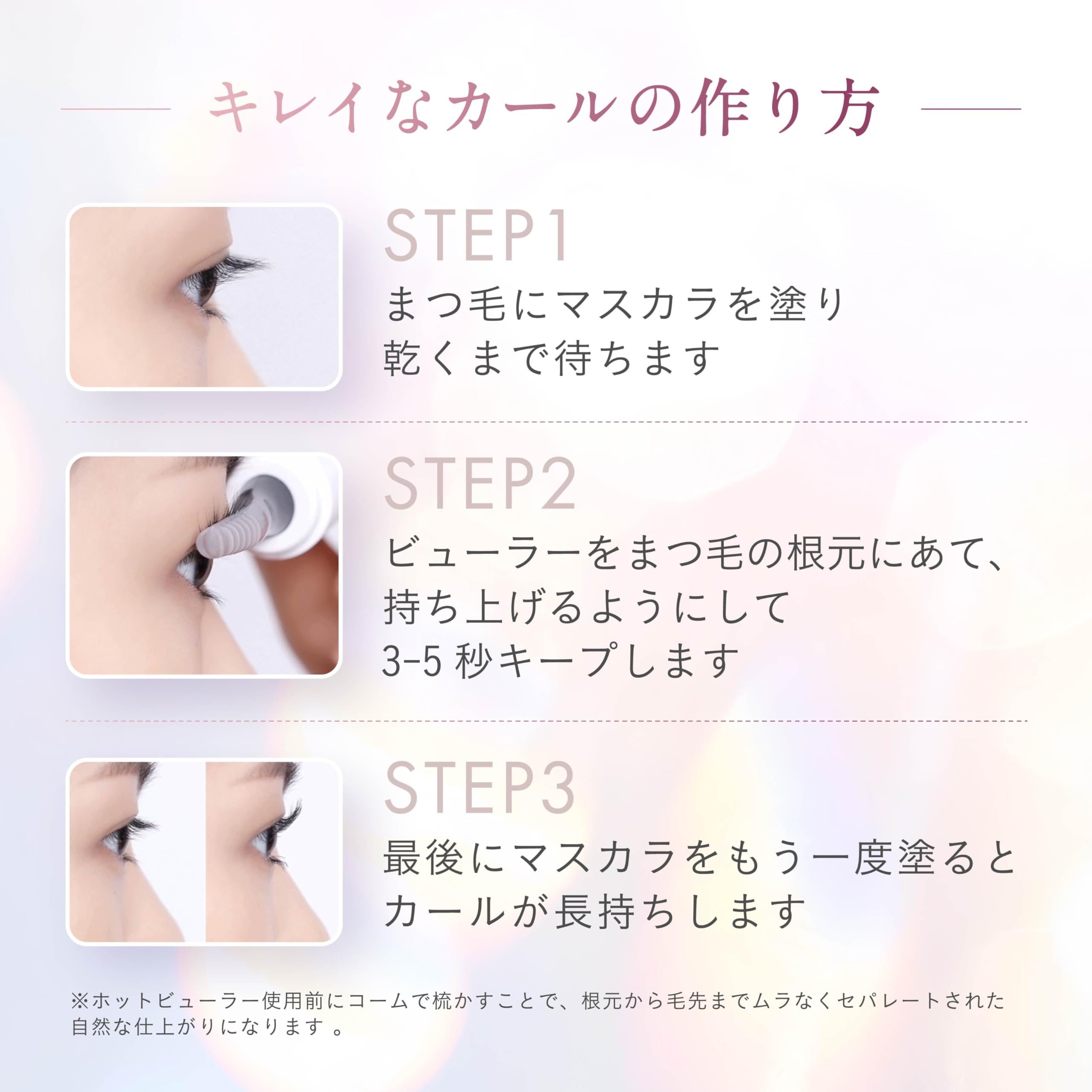 * 【温熱効果で作る究極の美カール】マスカラ下地とマスカラを用いてベースを作り、ホットビューラーで形を固定することで、まつ毛カール が 24時間キープ できるよう設計されています。化粧ポーチにも入るサイズで持ち運びにも便利朝バッチリメイクを決めてきたのに夕方にちょっと落ちてきてる…!!なんて時にもサッとお使いいただけます。