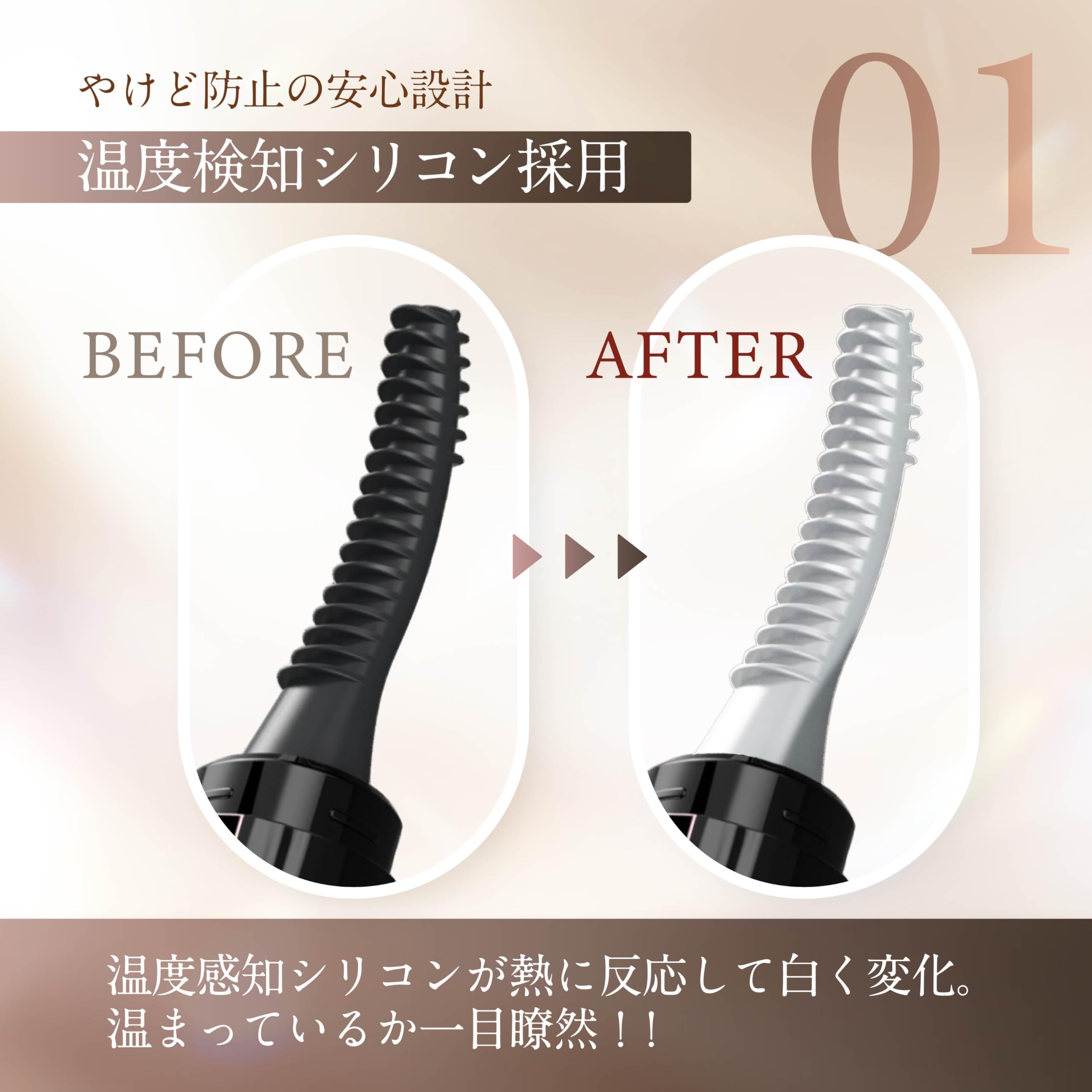 * 【火傷防止、温度検知シリコン採用!!】「温度が上がっているか分からない」「触って火傷をしてしまった」など、従来のホットビューラーは熱線がむき出しの為様々なトラブルがありました。RENAGEホットビューラーは温度検知シリコン素材を採用しており、温度が上がるとブラシの先端部分が黒色→白色に変化し使用可能な状態が一目で分かりとっても安全です!
