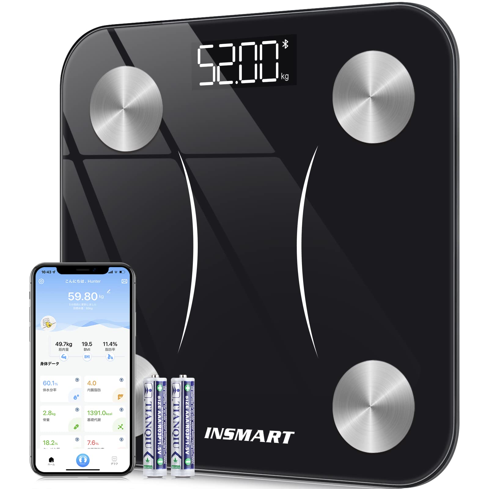 【体重計】INSMART 体脂肪計・体組成計 16項目測定可能 体重計 スマホ連動 ヘルスメーター 人気 体重計 Bluetooth対応 260H(日本語対応APP&取扱説明書)(ブラック)