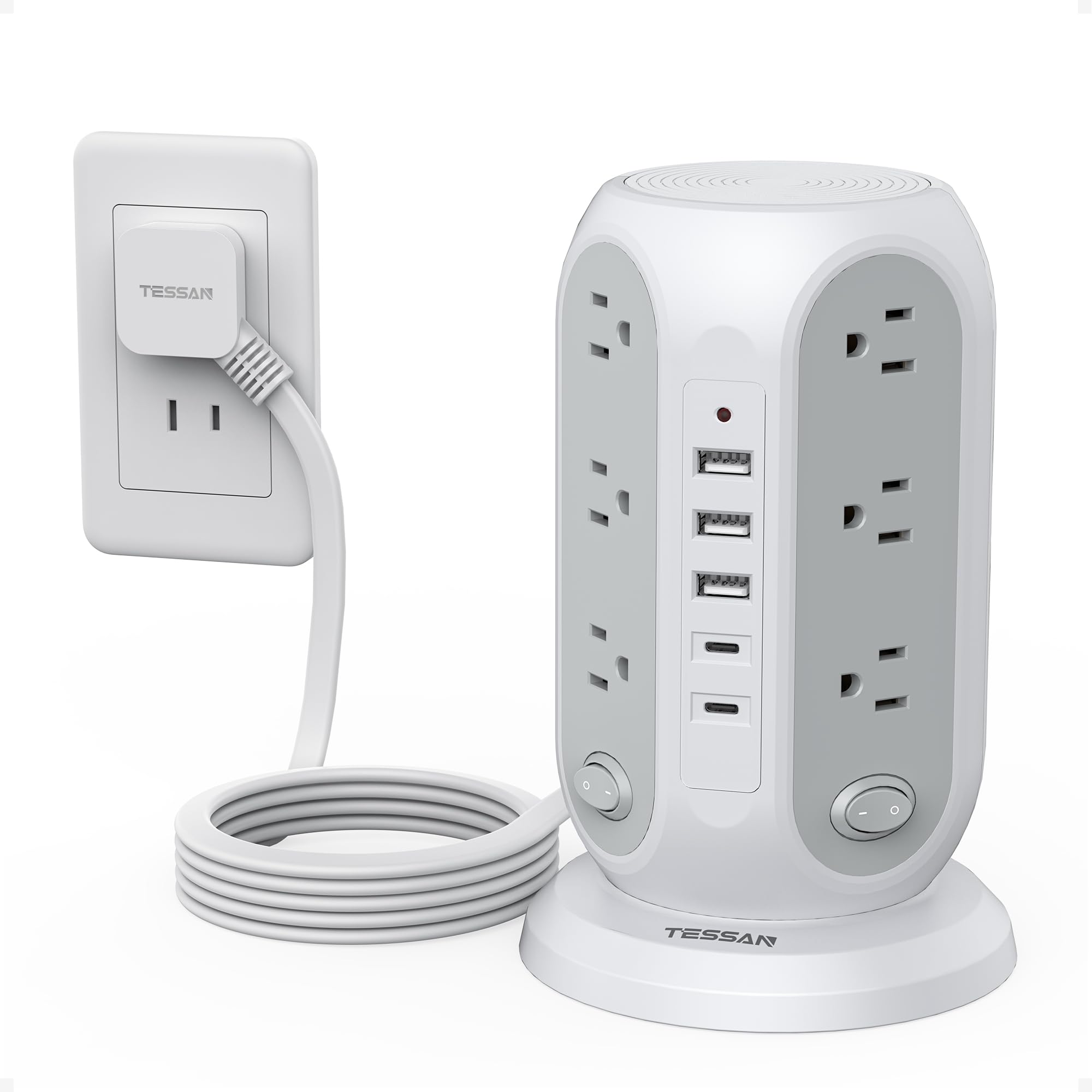 電源タップ タワー型 スイッチ付き 薄型プラグ 延長コード 2m 12個ACコンセント 4個独立スイッチ USBポート5個(Type-A/C) TESSAN テーブルタップ たこあしコンセント タコ足配線 マルチ OA 雷ガード 省エネ mini型