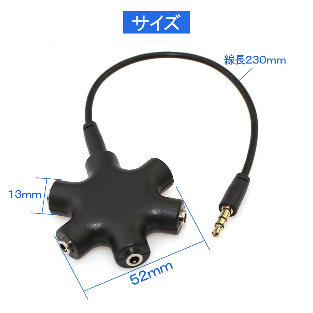 マルチイヤホンスプリッター 3.5mm ステレオイヤホンプラグ 5ウェイ 6ポート イヤフォンジャック分配器 メス接続器 ヘッドフォンアダプタ オーディオスプリッター コネクター 3.5mmステレオケーブル (ブラック)
