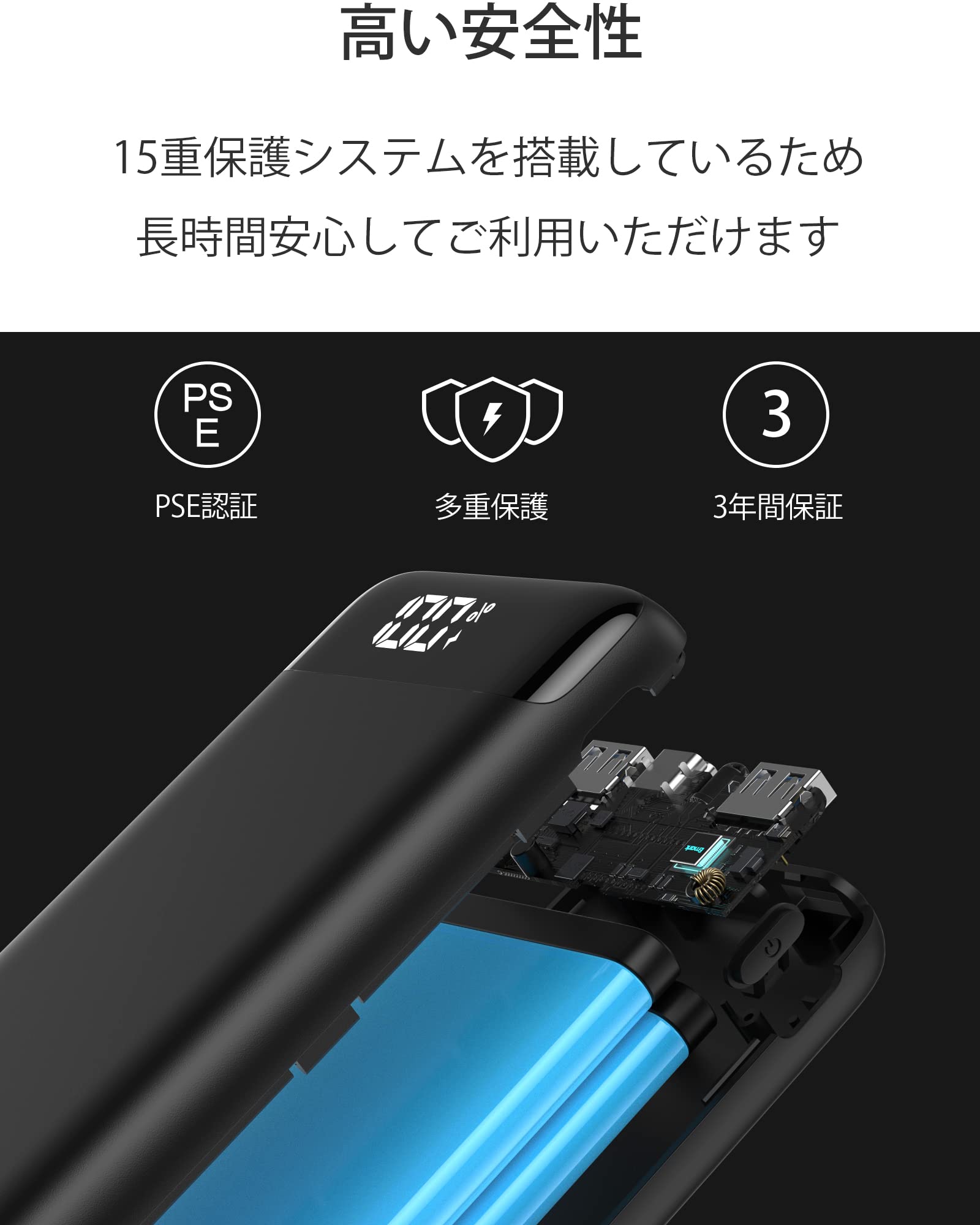■ 【安心保護機能】過充電保護、過放電保護、過熱防止、漏電保護など各種保護機能を備え、PSE・FCC・METI・RoHSなどの認証を取得し、パワフル&安全な充電をご提供いたします。