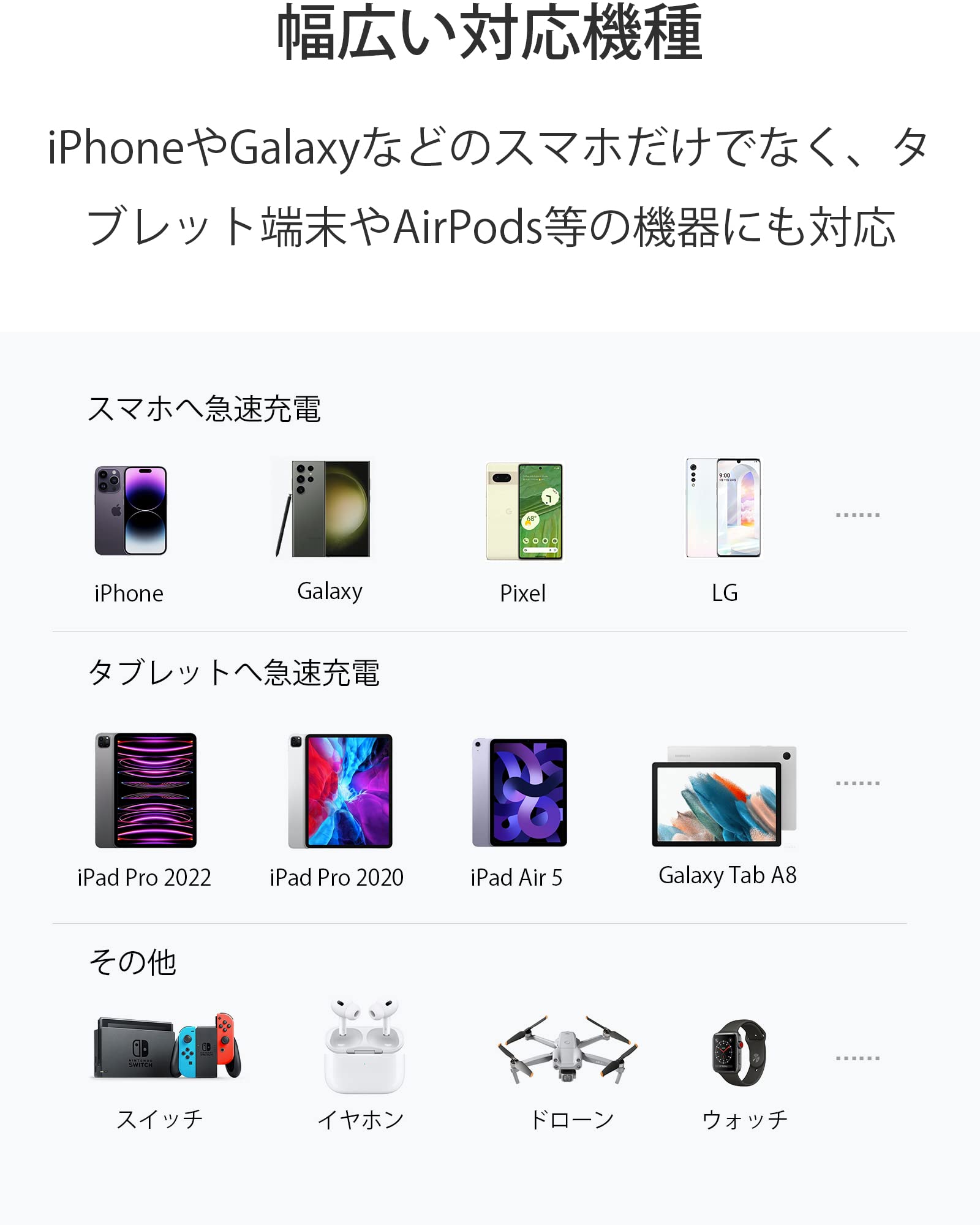 ■ 【幅広い互換性】数多くのスマホ(例:iPhone 16)やタブレットだけでなく、AirPods、Bluetoothヘッドフォン、フィットネストラッカー、スマートウォッチなども充電できます。