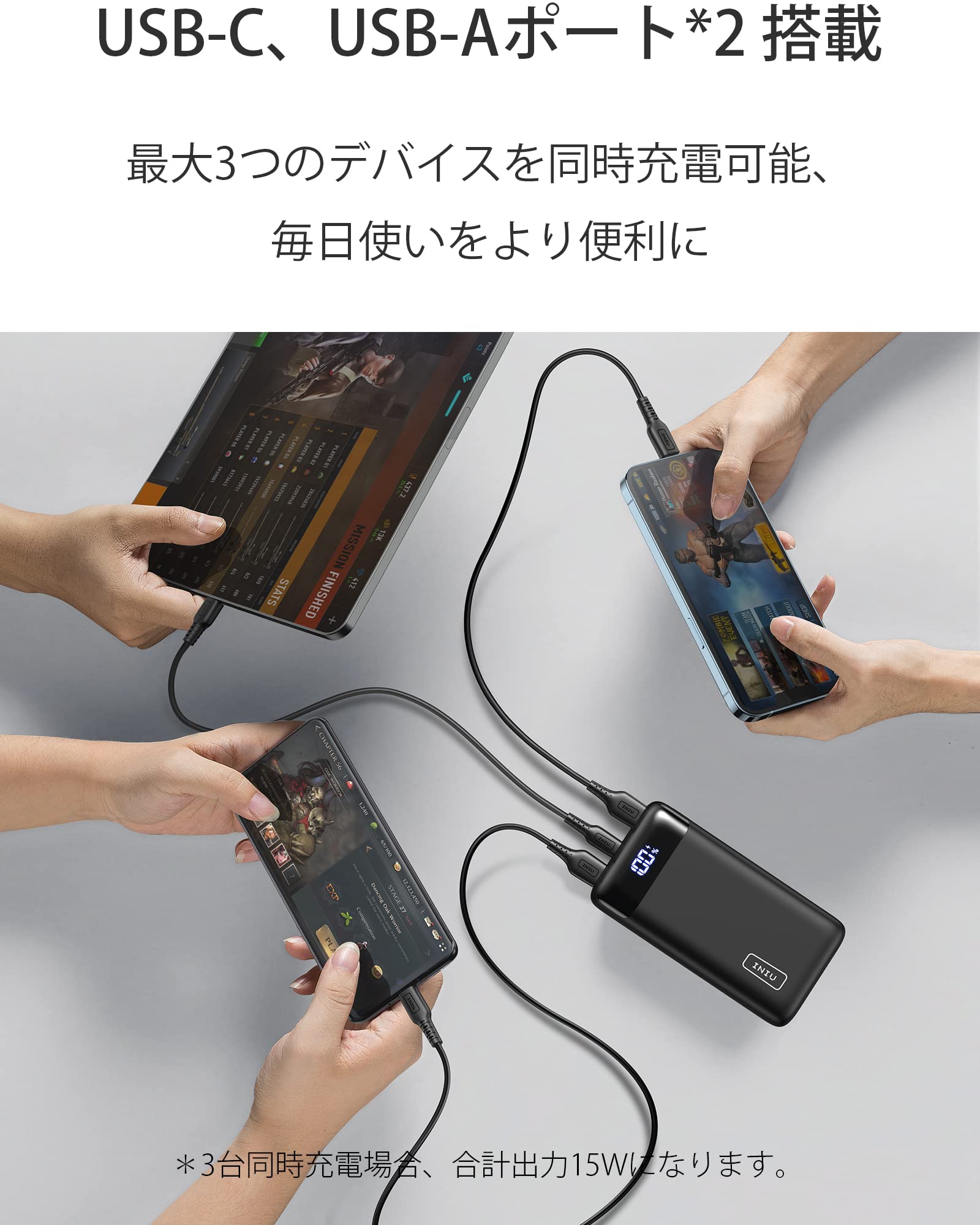 また、出力ポートUSB-C*1&USB-A*2を備えており、3つのデバイスの同時充電を実現できます。