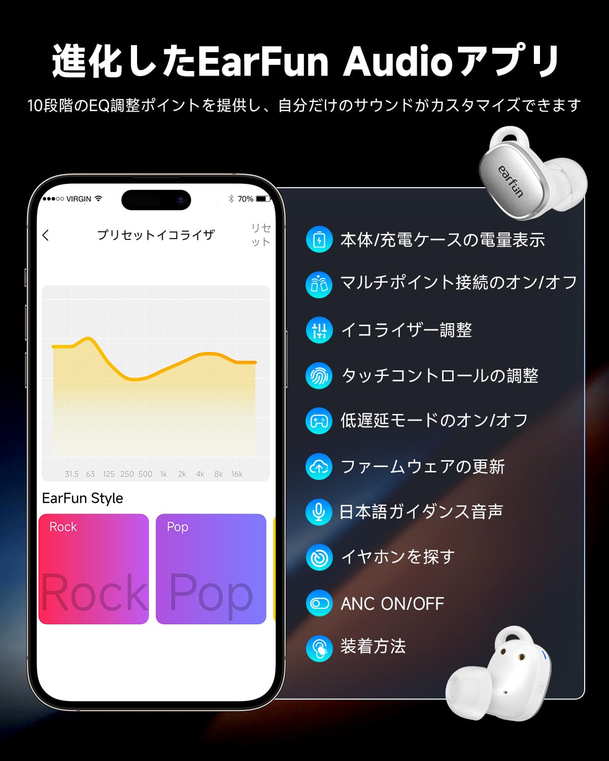 * 【43dbのディープアクティブノイズキャンセリング、いつでも音楽を静かに楽しむ】フィードフォワード+フィードバックのハイブリッドアクティブノイズキャンセリングにより、最大43dBまでノイズを低減します。騒々しい屋外環境や混雑したバスや電車でも、ノイズキャンセリングモードをワンタッチでオンにして、いつでもどこでも静かな世界を手に入れましょう。周囲の会話を自由に聞きながら音楽を楽しむために環境音モードもサポートされています。【イヤーフックデザイン】パッケージには4つの異なるサイズのイヤーチップとイヤーフックが付属しています。最適なノイズキャンセリング効果を得るために、自分に最適なイヤーチップとイヤーフックを選び、耳に密着させてください。